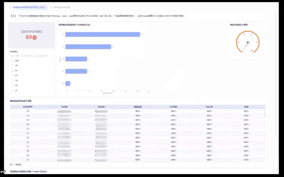 由于平台编码问题,同一件工厂侧的商品sku、放到跨境平台基于颜色尺寸衍生出各种不同的变体和产品编码。商品的统一编码和维护一直都是中小型卖家的一大痛点。把数据从报表搬到BI上后,这些数据质量的不规范问题也能得到及时的暴露和展示。