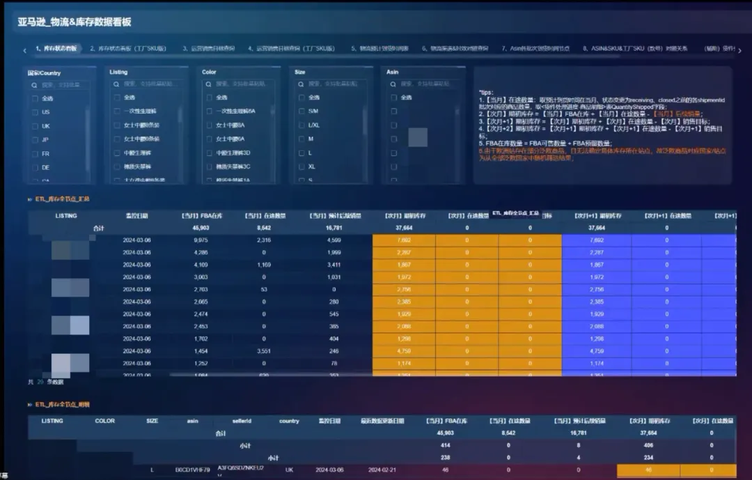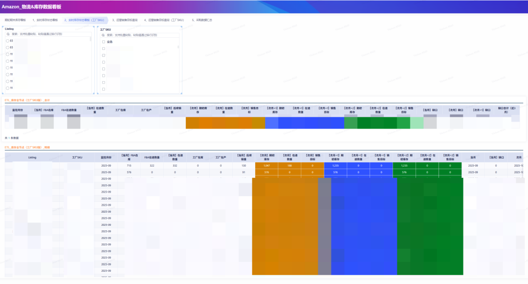 通过对接亚马逊库存报告和OMS系统,结合历史销量与运营预测,实现对工厂端sku和亚马逊平台侧的asin的当月库存和未来库存做预测和监控;同时接入货代提供的头程物流信息,实时追踪在途库存,帮助采购和运营精准掌握补货节奏。