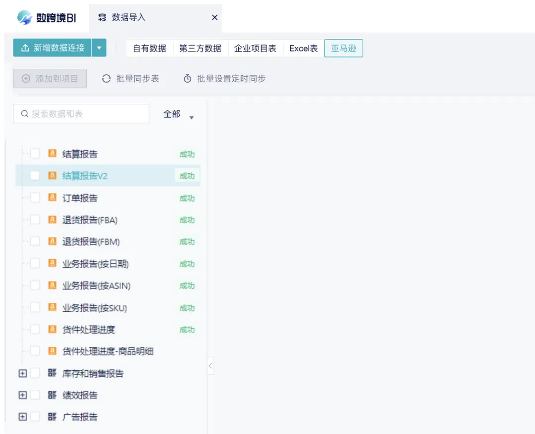 通过数跨境BI直连亚马逊数据源的功能,支持直接导入亚马逊所有相关的销售、退款、广告、仓储等收入、成本和费用数据报告。