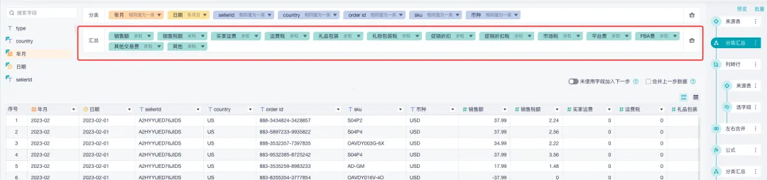为了更清晰地了解每个SKU的销售表现,在交易订单数据中提取每个SKU的销售数量、销售金额、亚马逊佣金、FBA配送费等数据。