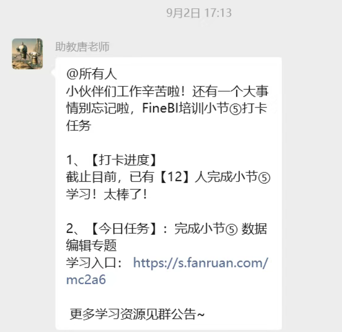 1、线上培训于8月27日—9月5日开展,为期10天的FineBI线上打卡营,共设置8个小节,累计时长9小时,为学员们夯实了数字分析工具应用的基础。