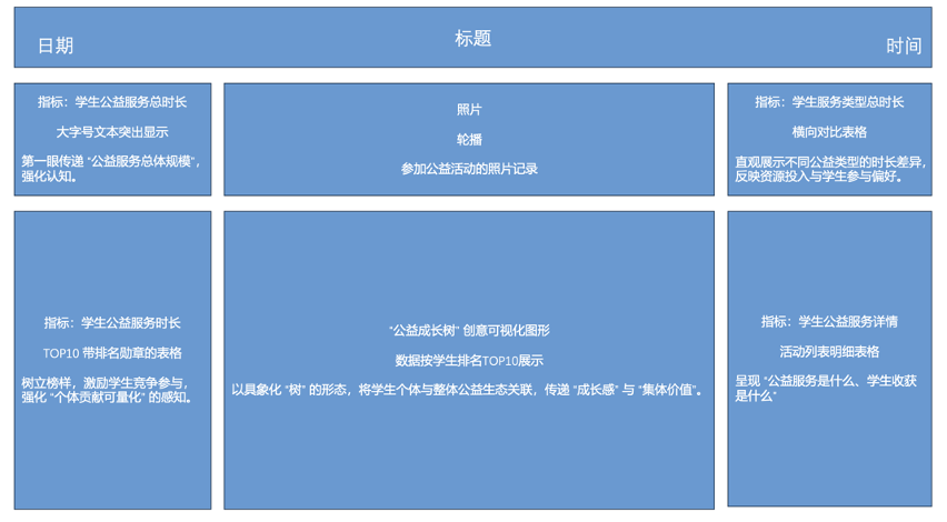以学生公益服务全生命周期可视化,拆解思路从“宏观规模→结构分布→个体贡献→微观详情” 四层递进,全面覆盖公益服务的 “总量、类型、个人、活动” 维度,解决 “公益服务数据分散、价值难感知、参与无反馈” 的核心问题。