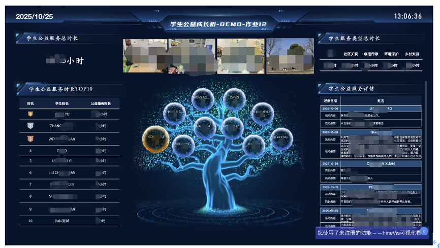 分享大屏主题为“学生公益成长树”场景: