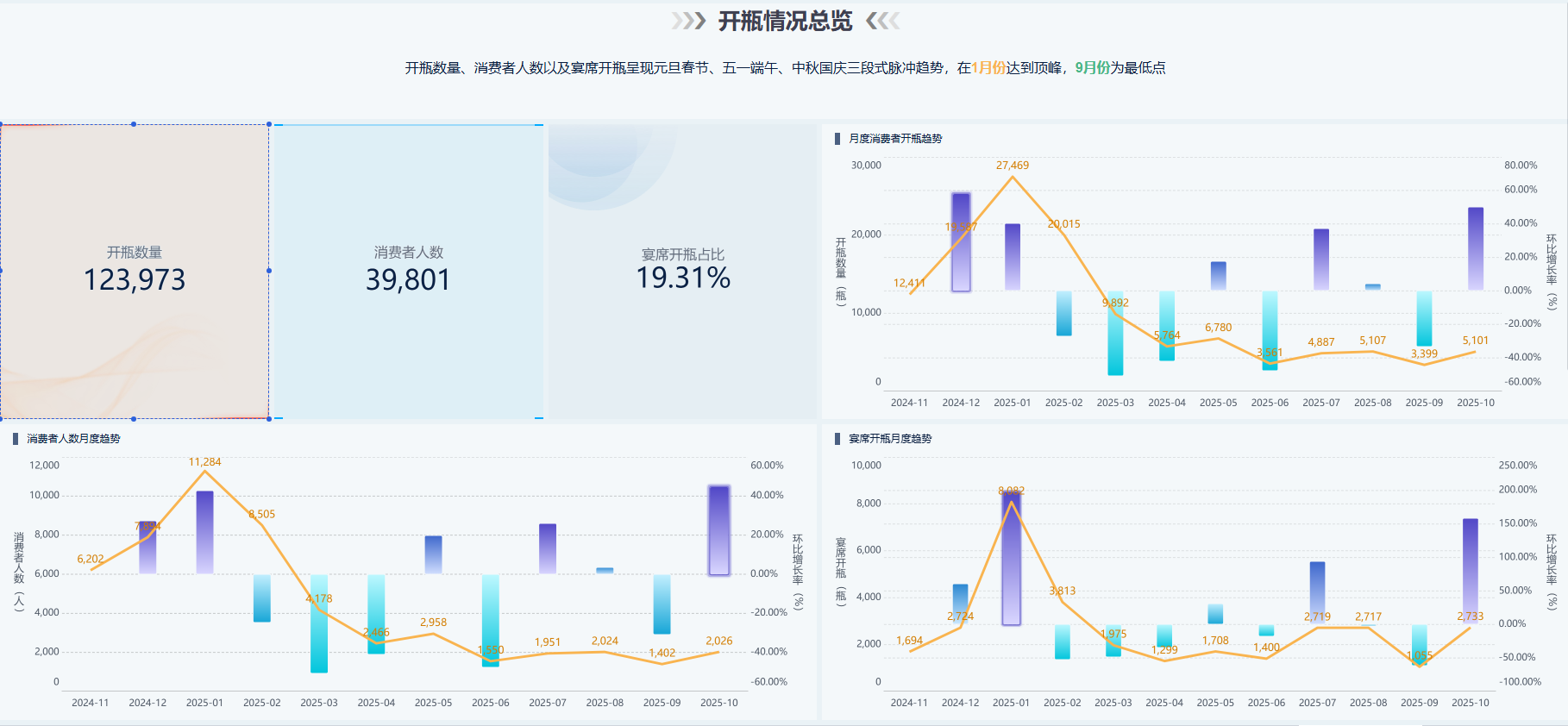 - 业务含义:呈现开瓶数量、消费者人数、宴席开瓶占比的整体概况,以及月度开瓶趋势、消费者人数月度趋势、宴席开瓶月度趋势,直观展示时间维度的消费波动规律。