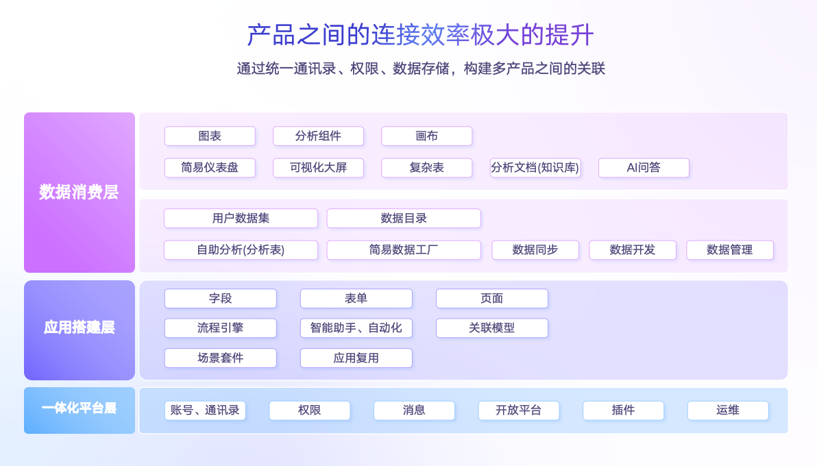原来帆软的产品策略是在某一个领域去发挥自己最大的能力,把某一个场景做到极致,所以我们各个产品都是相对比较独立的。我们有简道云,有BI,把简道云的数据要拿到BI来做分析,是存在一定麻烦的,需要做数据同步,权限也没有打通。但是在AI时代,我们希望数据能够极大地被利用起来,所以我们构建了一个统一的平台,让帆软的所有产品都接入这个平台,这个平台上统一了账号信息、通讯录、权限,以及再下层统一了数据存储层。A产品生成的数据可以在B产品里快捷地调用。通过这样的方式,我们可以把这些数据充分利用起来,让大模型发挥更大的威力。
