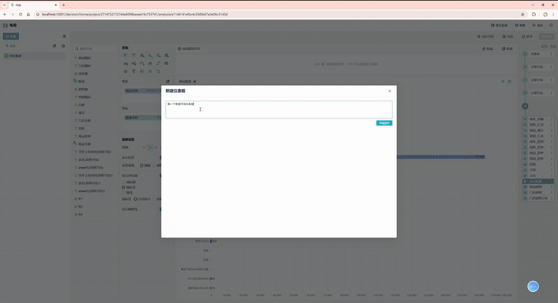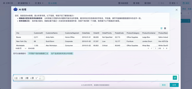 我们看这个视频,用户通过自然语言去生成了一个相应的分析结果,这个分析结果可能比较复杂,演示的内容相对简单。第一步是把大模型生成自然语言在我们的工具里可以被应用,输出结果,二是把生成分析结果的过程转成原来分析工具中的可视化步骤,有了这个步骤,用户可以根据需要去调整,AI就能够辅助用户去做分析,而不是替代用户去分析。“辅助”还是“替代”这两者的差距就在于最后谁对这个结果负责,显然人才是要对这个结果负责的。
