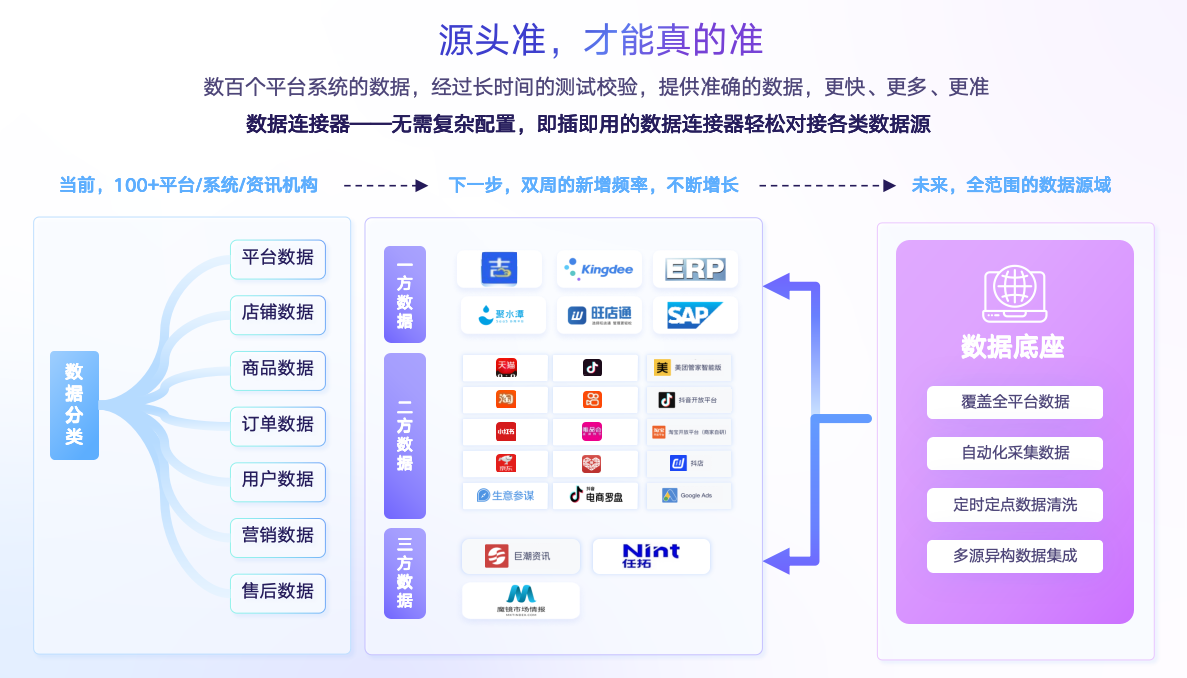 前面讲了数据不准确是非常令人头疼的,我们公司内部也有这样的例子,商务跟销售战区代表说,你的合同跟开票数据对不上,什么原因?不知道,排查之后发现原来有一个数据是通过别的系统录入的,没有走统一的入口,流程不规范导致源头数据不准确。面对数据不准确问题,更多时候只能靠人工去核查排查问题,我们认为源头准才能真的准,源头数据是否准确,决定了接下来的分析过程以及最终的结果能否给出准确的信息,而准确的结果才能帮助我们的业务。我们经过大量人力投入,接入了数百个第三方的应用平台,几千张表的数据,这些数据经过了我们跟早期客户共创试,保障数据准确性,这些准确数据才能更好地帮我们做决策,做应用。
