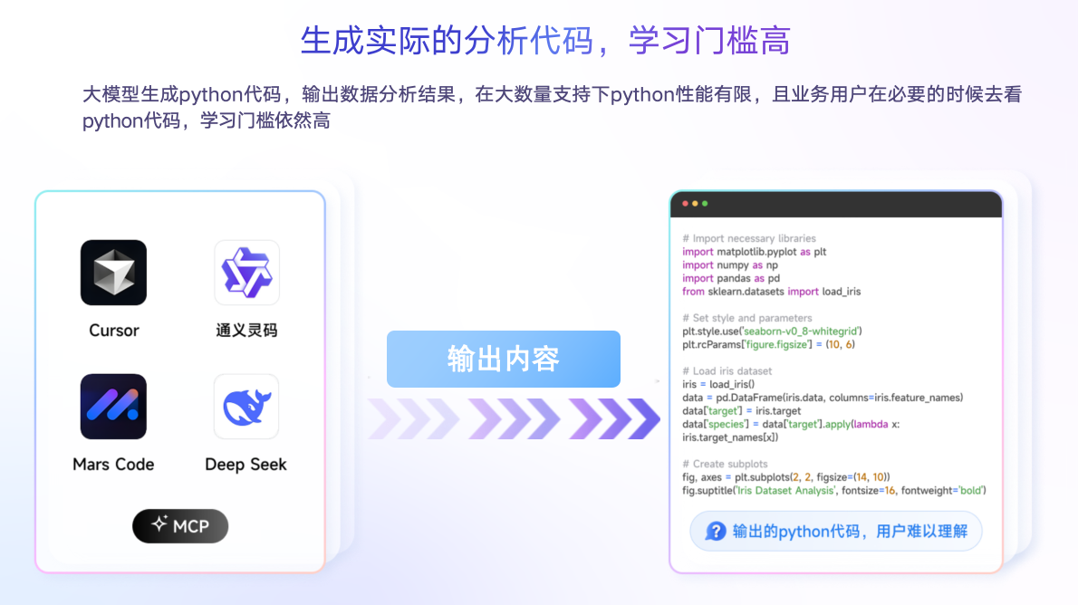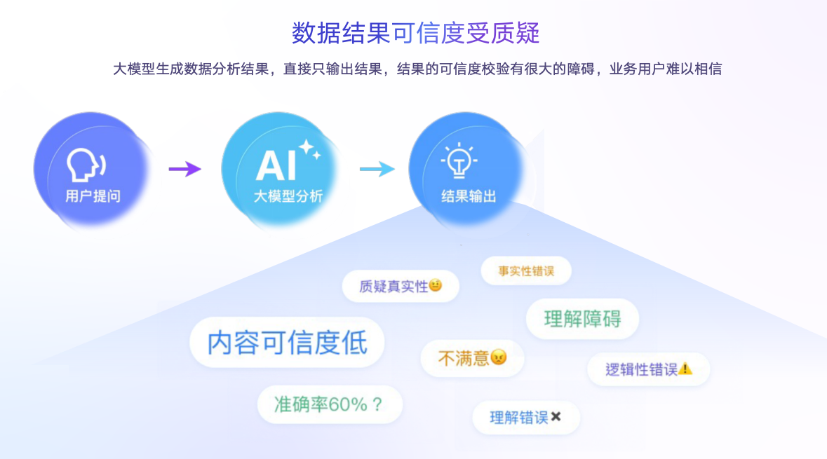 有没有别的办法?肯定是有的,大模型非常擅长写代码,并且代码准确率通常能够达到95%以上。但是它并不能解决两个普遍性的问题,一是企业级数据分析里,涉及到的数据量非常大,这种情况下,大模型很难支撑并且输出正确的结果。二是我们希望大模型能够降低大家做数据分析的门槛,但是它写出来的是代码,阅读理解的难度大,反而提高了数据分析的门槛。而用户想要的非常朴素,既要简单的分析过程,也要简便的校验,快速地进入分析系统里对过程进行核查。 因此,我们一直在围绕客户痛点和客户的需求去迭代我们的产品。