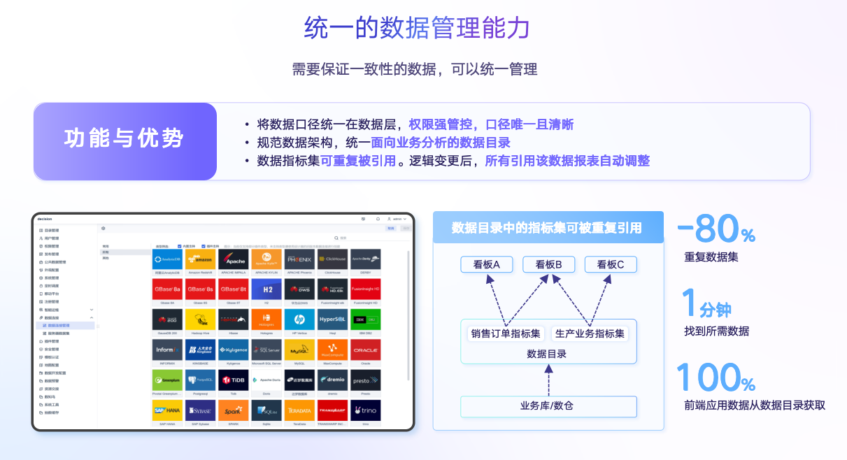 另外,要保证数据的准确,还要有能够统一定义数据的地方,因此我们也提供统一的数据管理能力。原来自助分析比较流行,很多业务部门要各自做分析,这样带来的后果是每个业务部门有自己分析的口径,导致数据口径不统一。因此,我们在新的版本里面提供了对统一数据的管理方案——指标平台。