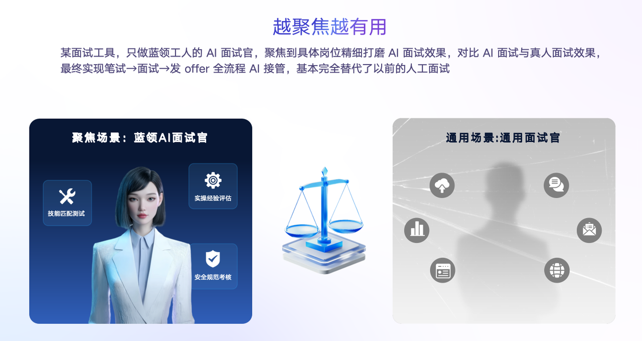 这家企业在探索中逐个对比AI面试和真人面试的差距,不断优化升级,最终实现了从笔试到面试发OFFER全流程AI接管,替代了以前的人工面试。在这样一个非常聚焦的场景下,大模型可以完全替代掉原来人工的介入,从而极大降低了成本,这就是越聚焦越有用。