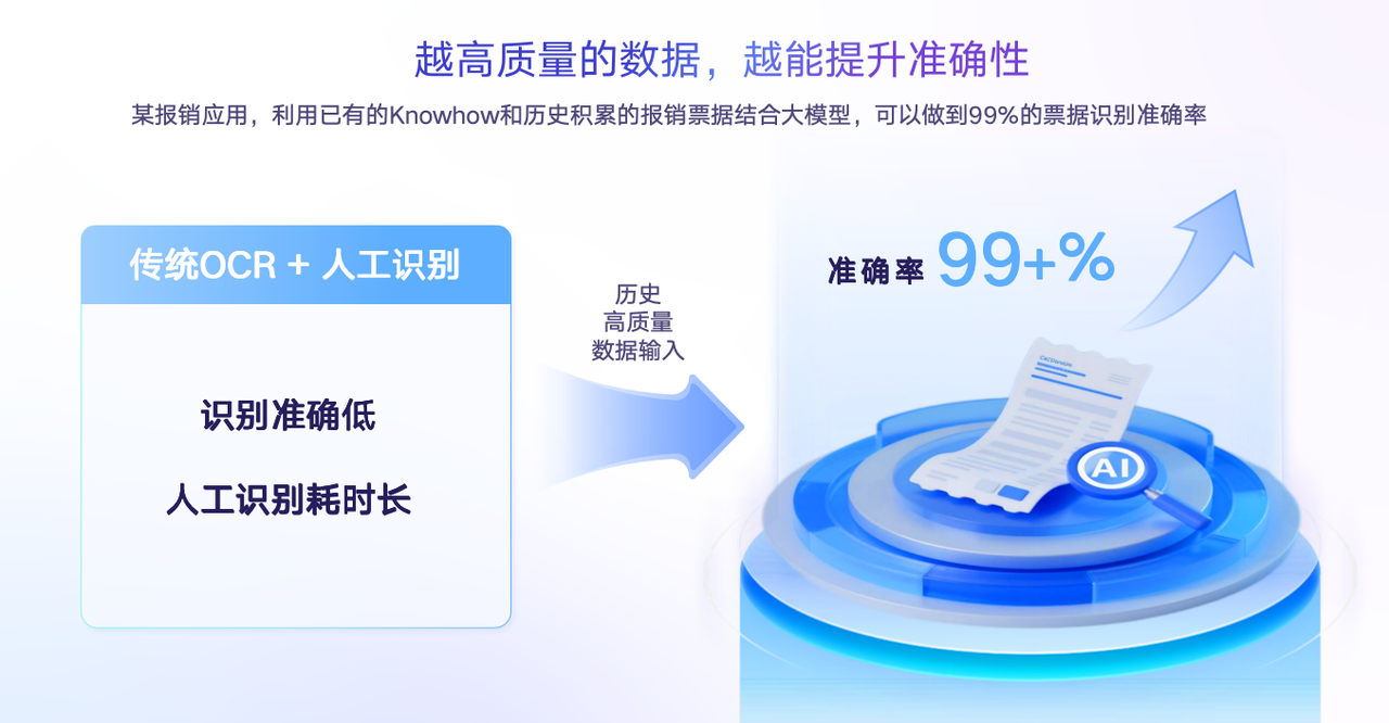 第二个例子是一家做报销应用的公司,跟他们技术交流的时候,他们说以前通过OCR识别票据,因为全球各个地方的票据格式差距大,OCR识别后还要加一道人工识别,OCR识别准确率只有80%-90%,人审核票据的工作依然减少不了。有了大模型后,结合原来人工校准后积累的高质量数据,对大模型进行训练,识别准确率提高到了99%以上,比人工审核的准确率还要高,几乎可以完全替代人力。这就是因为原来系统里积累的高质量数据,给了他们最大的帮助。
