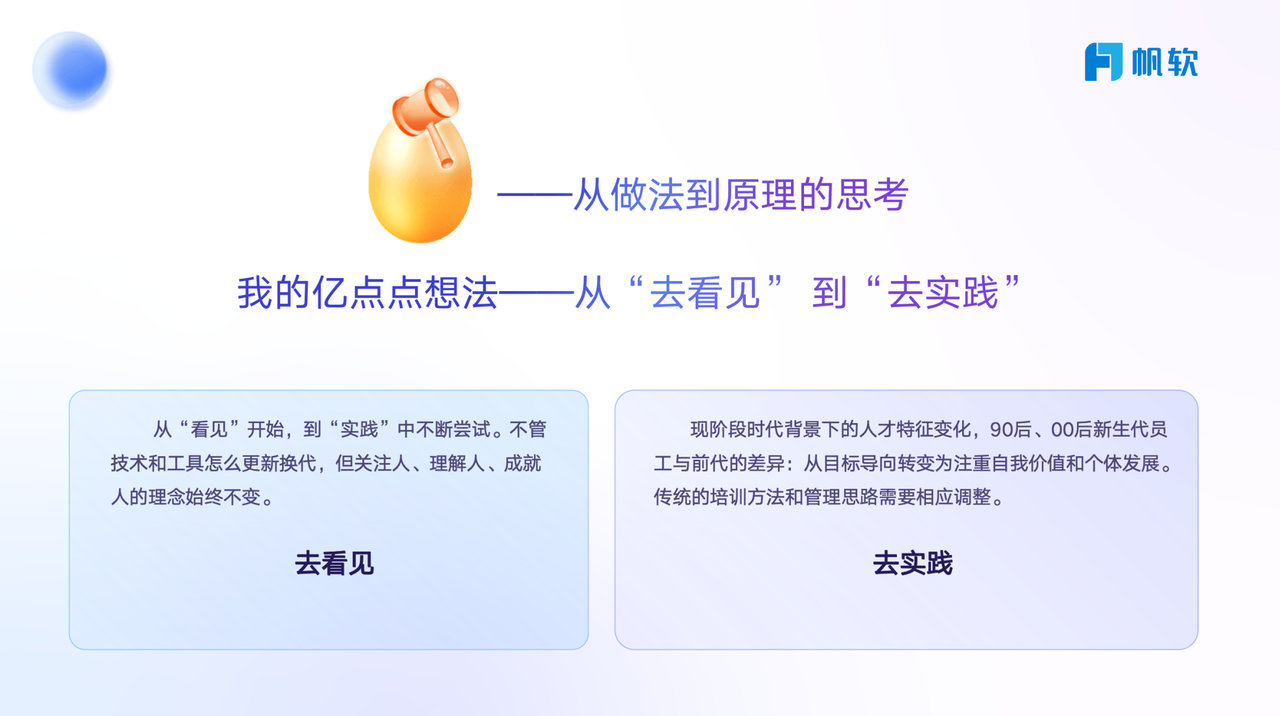 分享最后,负责人留下了两句值得深思的话:第一句是“去看见、去实践”—— 看见各层级的动力与摩擦力,在实践中减弱阻力;第二句更核心:“看见人,找到摩擦才是成功的开始”。