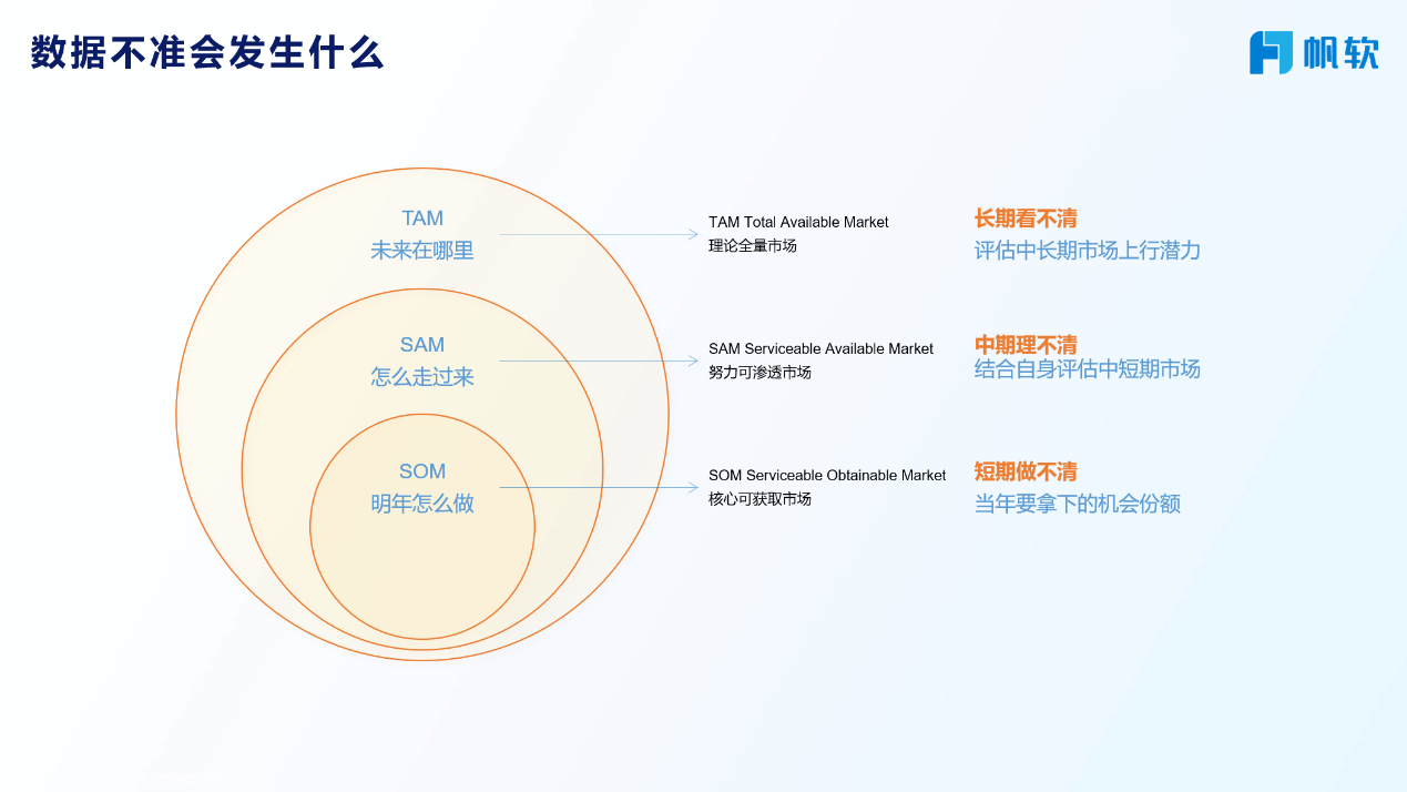 帆软CIO杨扬聚焦于数据能力如何系统化融入企业经营管理,分享了帆软在数字化建设中的方法论与实战经验。他从“数据不准会发生什么”切入,指出企业若无法清晰洞察市场全局(TAM)、把握可渗透市场(SAM)、锁定可获取市场(SOM),就容易陷入“长期看不清、中期理不清、短期做不清”的困境。