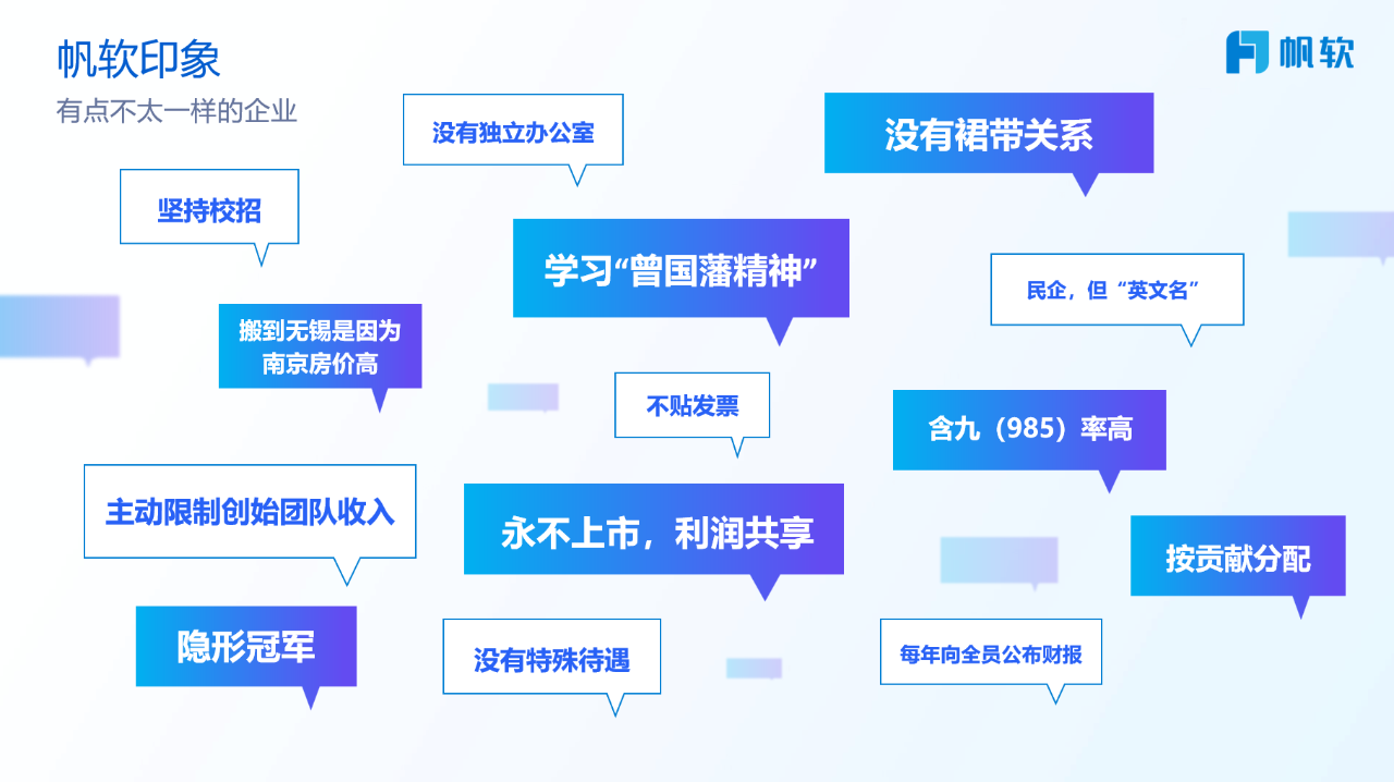 在整个分享中,Leo多次强调“让数据成为生产力”这一根本使命如何贯穿帆软十九年发展历程。他特别指出,企业文化不是口号,而是体现在日常经营的每一个细节中——无论是“坚持校招”的人才策略,还是“按贡献分配”的激励体系,都是帆软文化价值观的具体落地。这些独特的文化实践共同构成了帆软作为“有点不太一样的企业”的鲜明特质,也成为支撑企业持续健康增长的内在动力。