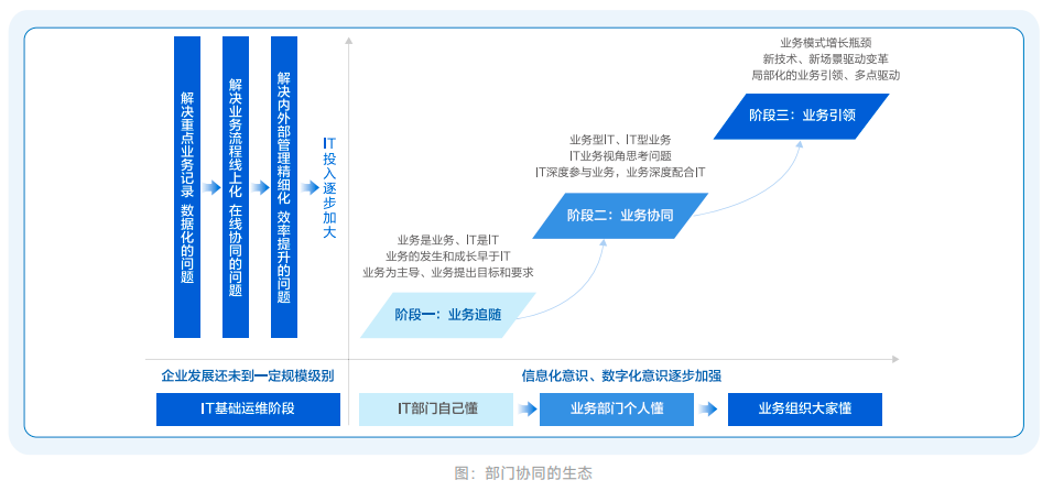 人机协同的本质是业务流程与技术赋能的强关联,背后离不开业务部门与IT部门的跨部门携手与协同。企业应打破传统的职能分割壁垒,建立跨部门的协作机制。IT部门应当不止于扮演业务部门“追随者”的角色,以业务为主导被动地响应业务需求,更应该成为业务创新的合作伙伴,是业务部门的“同路人”乃至“引路人”。业务部门也需要加强自身的数智化意识,主动参与技术方案的设计和优化,让数智化意识从“IT部门自己懂”逐步演变为“业务组织大家懂”。