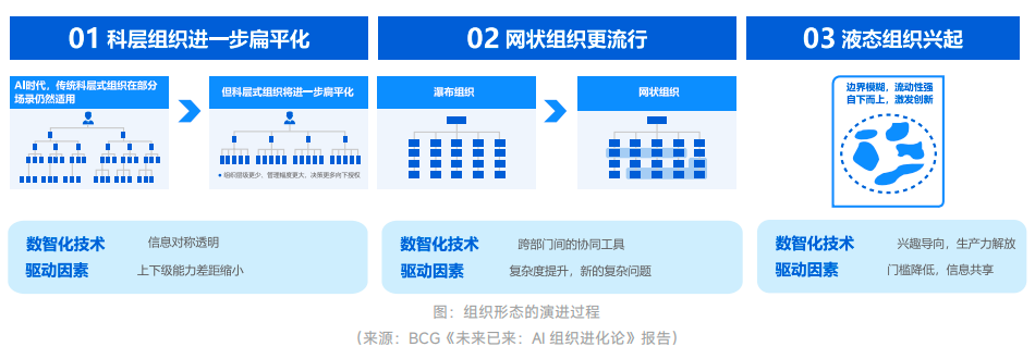 根据BCG《未来已来:AI组织进化论》报告研究表明,企业可以沿三个阶段对组织形态进行重构。首先是扁平化科层制改造,借助AI实现信息透明和决策智能化,缩减中间管理层级的数量,将决策权下沉到业务前线以更快地响应业务变化需求。其次是构建网状组织,打破部门间的壁垒实现跨职能协作。以AI技术为支撑下的信息实时共享,能够让跨垂线的团队快速达成业务共识,有效应对市场需求和技术环境变化。第三是培育液态组织,为基于兴趣和目标驱动的员工间的自发协作提供制度支撑,让每位员工都成为组织网络上的动态节点。液态的组织形态允许员工根据业务目标、个人专长和市场机会快速组合成临时性的工作小组,最大化地释放了员工的创新潜能,为企业在多变的外部环境中保持竞争优势提供了敏捷响应的组织架构保障。