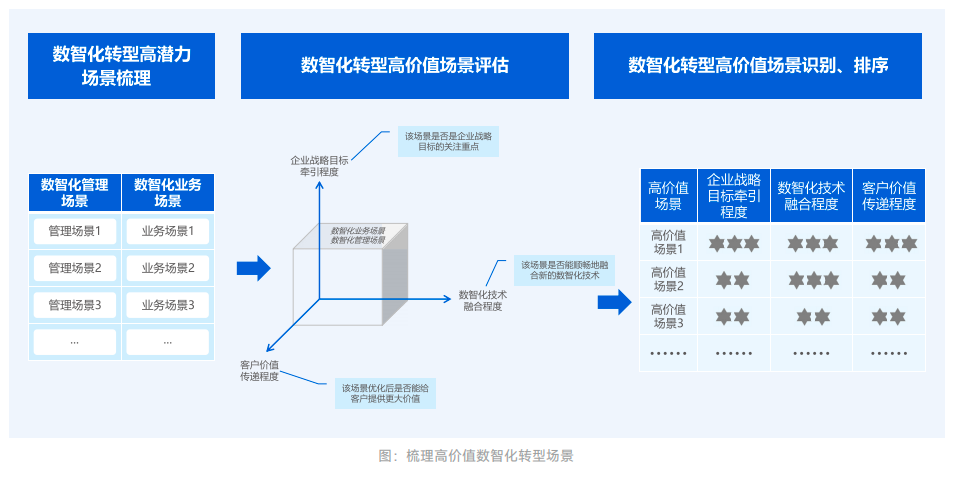 企业可以从数智化管理场景和数智化业务场景两个维度进行全面梳理,以数智化技术融合程度、企业战略目标牵引程度、客户价值传递程度等因素,全面构建高价值数智化转型场景评估框架。