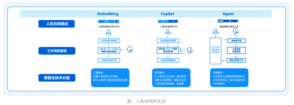 在人机协同方面,随着数智化技术的日趋成熟,AI对于人类员工的价值将从单纯的工具进化为具备自主性的代理,与之一并发生的是AI对于人类员工传统工作流程的深度参与和重塑。企业应摒弃“人工智能完全替代人工”的思维,转向“人机共生、优势互补”的协同模式,合理地设计工作任务的人机分工,例如让AI承担规则明确、重复性高、数据处理密集的任务,让人类员工专注于创意思考、复杂决策、情感交互、战略规划等高价值工作。