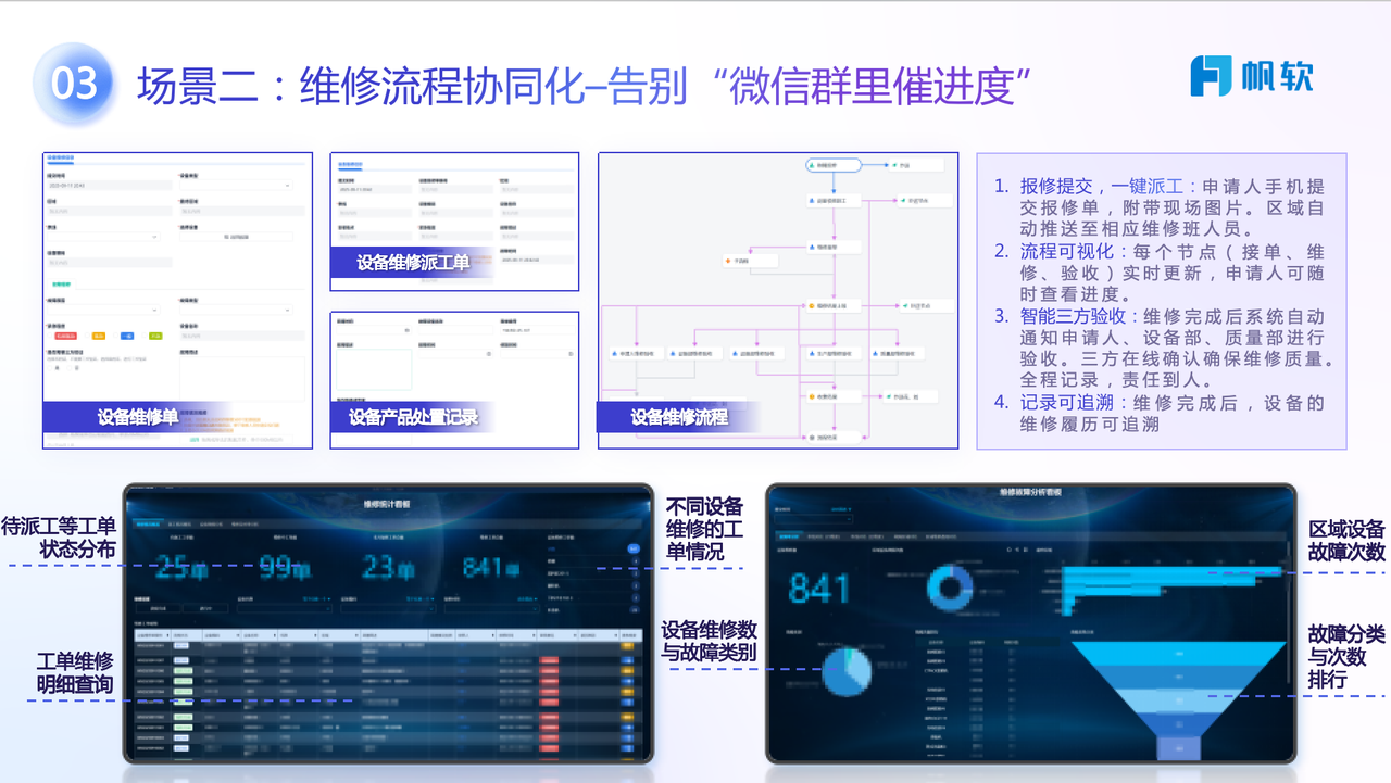 电子保修单替代纸质单据,报修人扫码提交后,流程自动流转至区域负责人、维修主管,报修人能实时查看进度,避免“单据在哪都不知道”的问题。