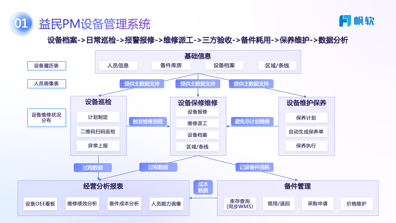 设备是工厂核心,负责人针对“维修靠老师傅经验、故障难追溯”的痛点,用简道云搭建了设备管理PM系统,构建了“设备档案-日常巡检-报警报修-维修派工-三方验收-备件耗用-保养维护-数据分析”的闭环。