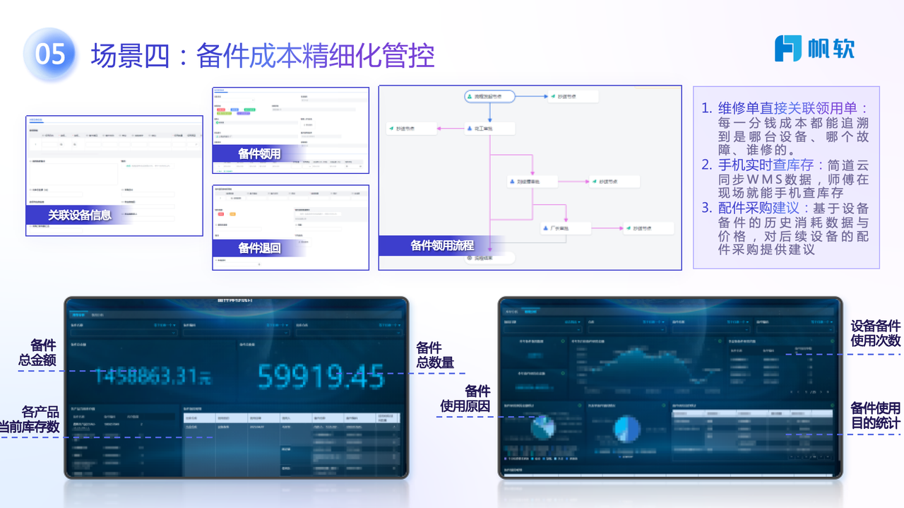维修师傅扫码即可查询设备关联的零件库存,在线提交物料领用单后,五金仓库能提前备货,既避免了“反复跑仓库问库存”的无效工作,又实现了“物料领用与工单绑定”,后续可通过数据统计“某条线年维修费用是否超设备采购价”,以此判断是否该更换设备。