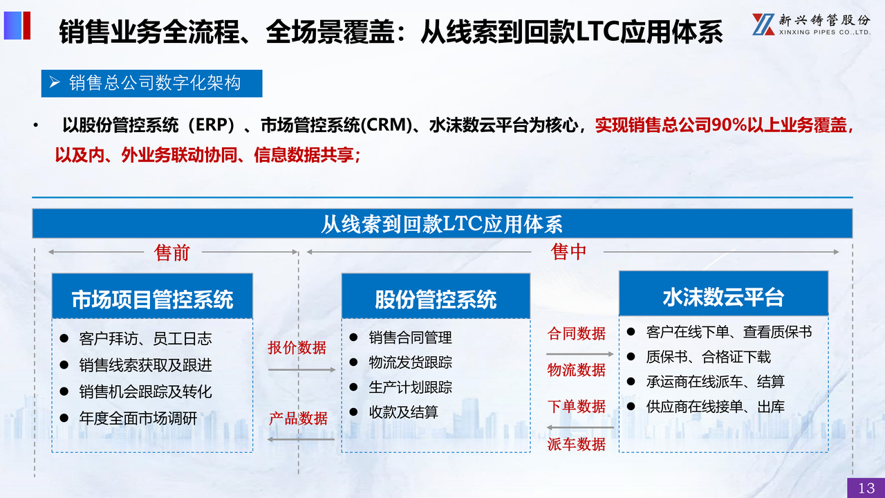 新兴铸管搭建了以ERP(股份管控系统)、CRM(市场管控系统)、水沫数云平台为核心的数字化架构,覆盖了销售总公司90%以上的业务场景,形成从“线索到回款(LTC)”的全流程闭环。