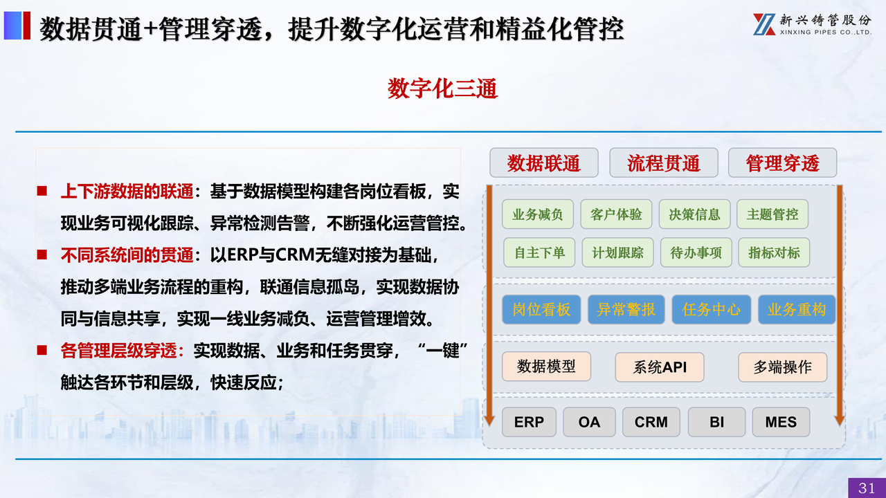 想让管理真正“穿透”,核心在“数据通”。新兴铸管从三个维度打通数据,实现精益化管控: