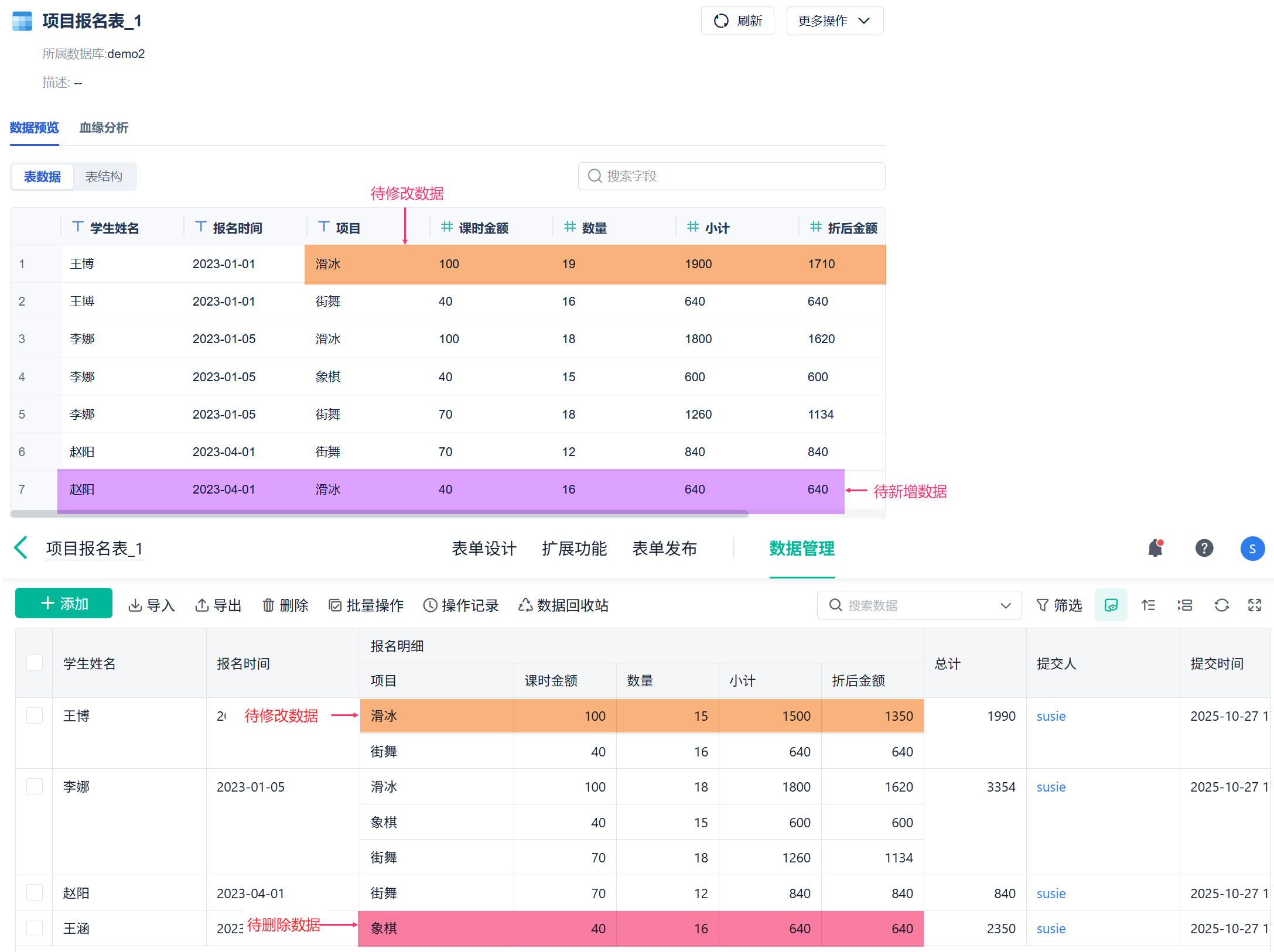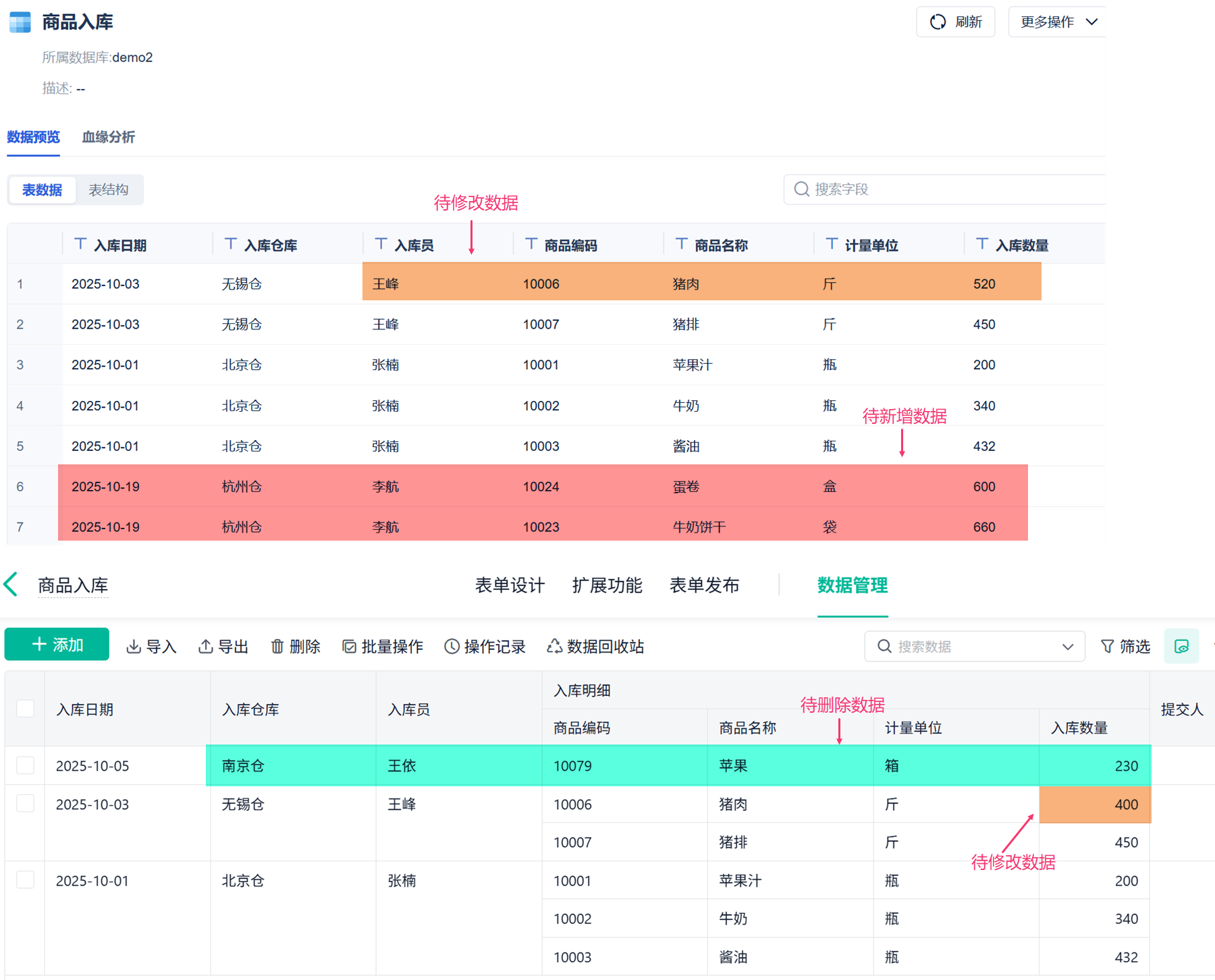 1)若简道云子表单中,存在主键字段(商品编码)。如下图所示: