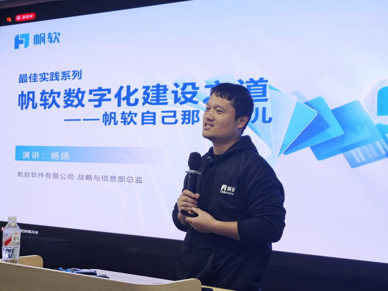 随后,帆软CIO杨扬分享了帆软数字化建设历程与经验,结合公司战略定位与业务流程,重点分享了战略落地数字化、LTC等流程数字化、财务数字化、经营分析会等重点项目,引发参会客户深深思考。