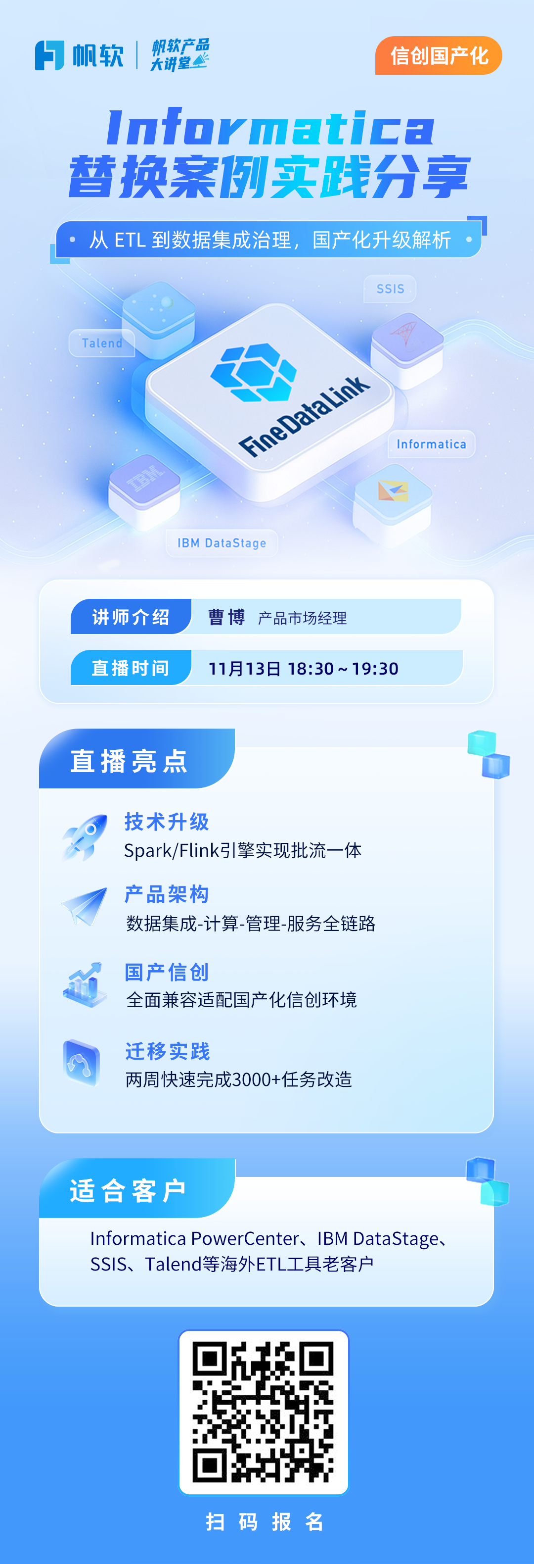 Informatica PowerCenter、IBM DataStage、SSIS、Talend等海外ETL工具老客户;