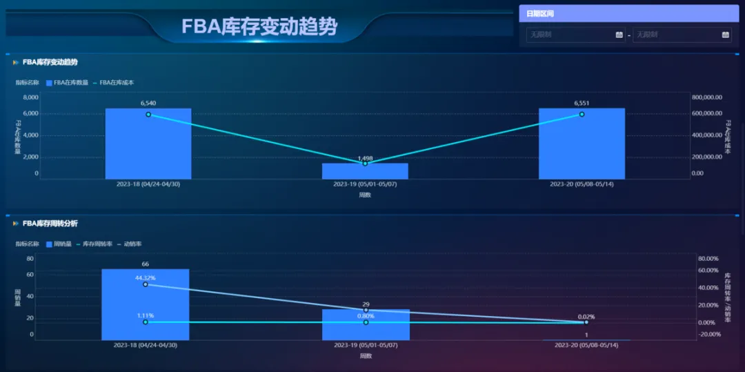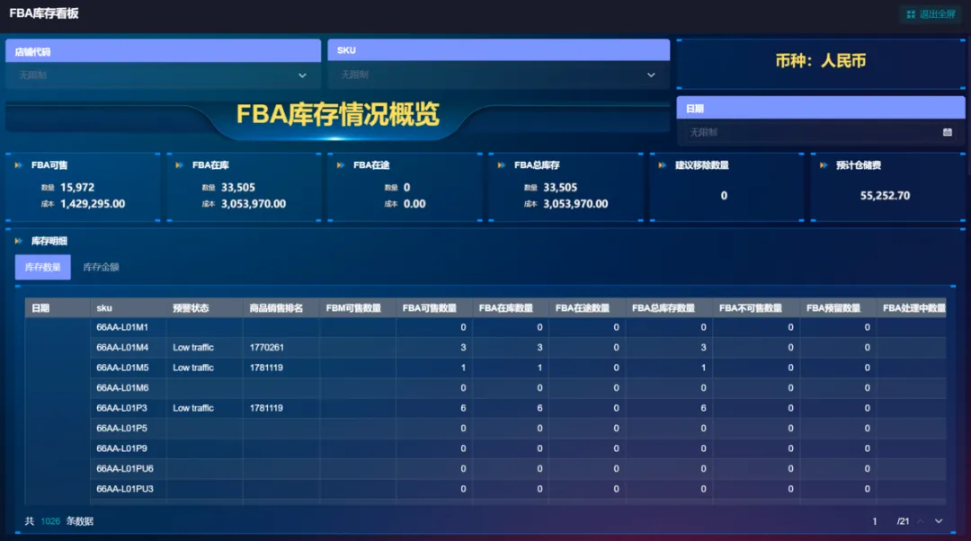 通过数跨境BI搭建的库存分析看板,可以分店铺和分SKU查看FBA可售、FBA在库、FBA在途、FBA总库存、预计仓储费、库存数量、库存金额明细等,查看FBA库存变动趋势,实现库存数据的统一可视化管理。