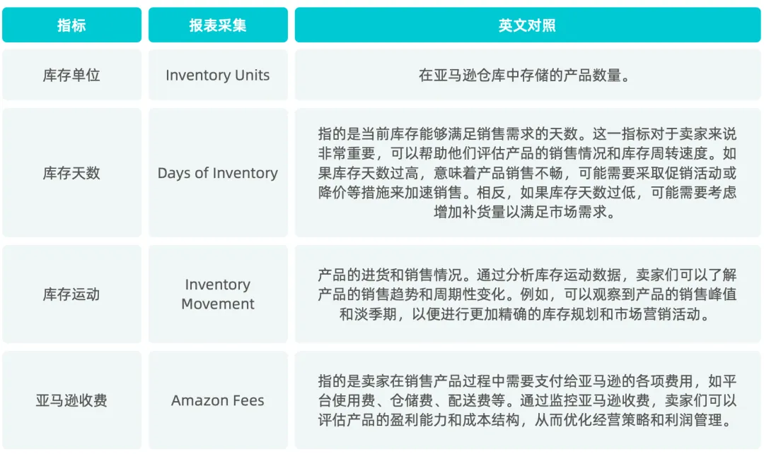 除了亚马逊报告中的基础数据,卖家还可以结合以下通用库存指标,构建一套完整的分析框架: