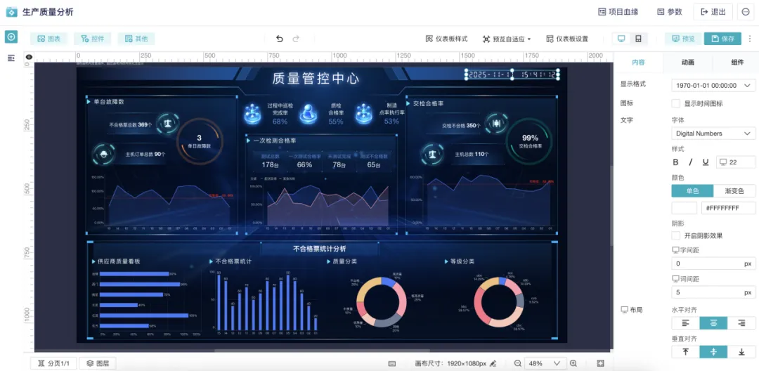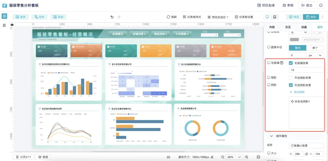 在仪表板编辑界面,支持画布自定义分辨率,确保与实际屏幕精准匹配。