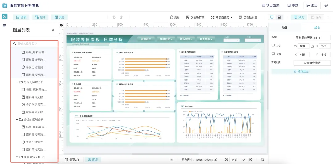 通过图层管理实现布局分离,将背景、标题与图表分层放置。将画布分为“核心指标区(上部)”、“主要图表区(中部)”、“实时清单区(下部)”,确保所有组件对齐、间距均匀,保持整体布局的整齐与平衡。