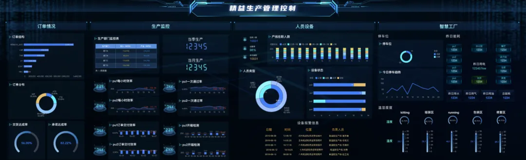展示实时生产数据,并实时监控设备的报警和运行状态,模块化的分区布局适配超宽屏,确保各类数据清晰可见,助力生产管理的高效决策。