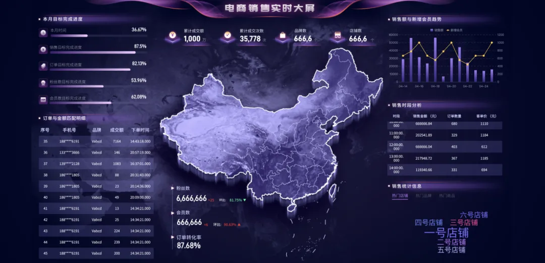 顶部展示GMV和订单数,左右两侧展示各平台的数据和变化趋势,实时更新销售数据和热点区域,确保决策者快速把握大促全局。