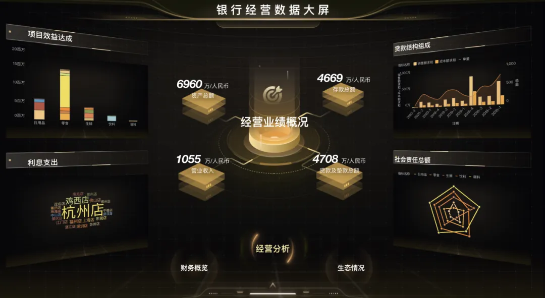 聚焦银行核心经营指标,左右两侧展示重点业务与趋势分析,底部菜单自动分页轮播,提供动态切换,帮助管理层快速了解银行的整体经营状况。