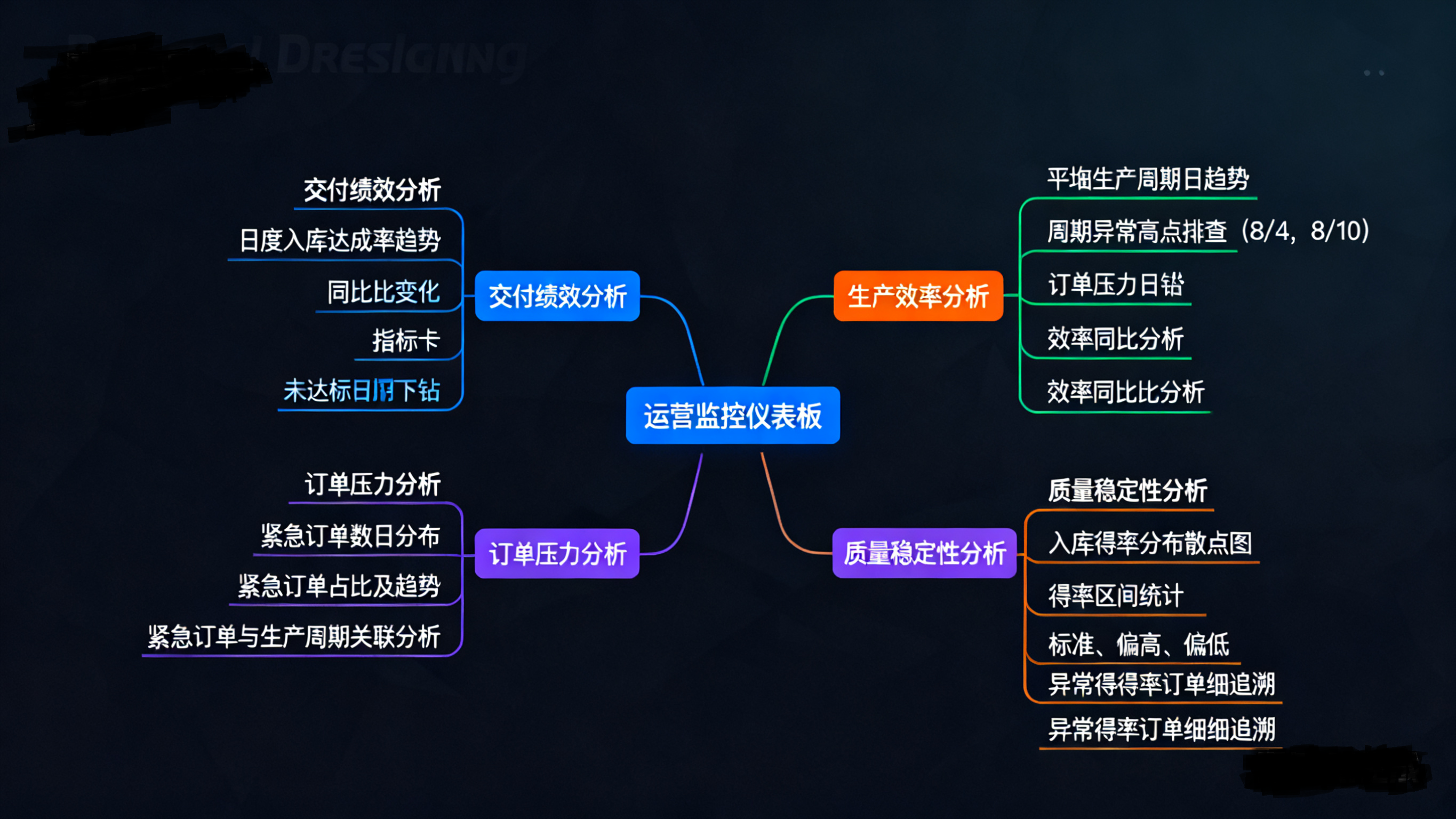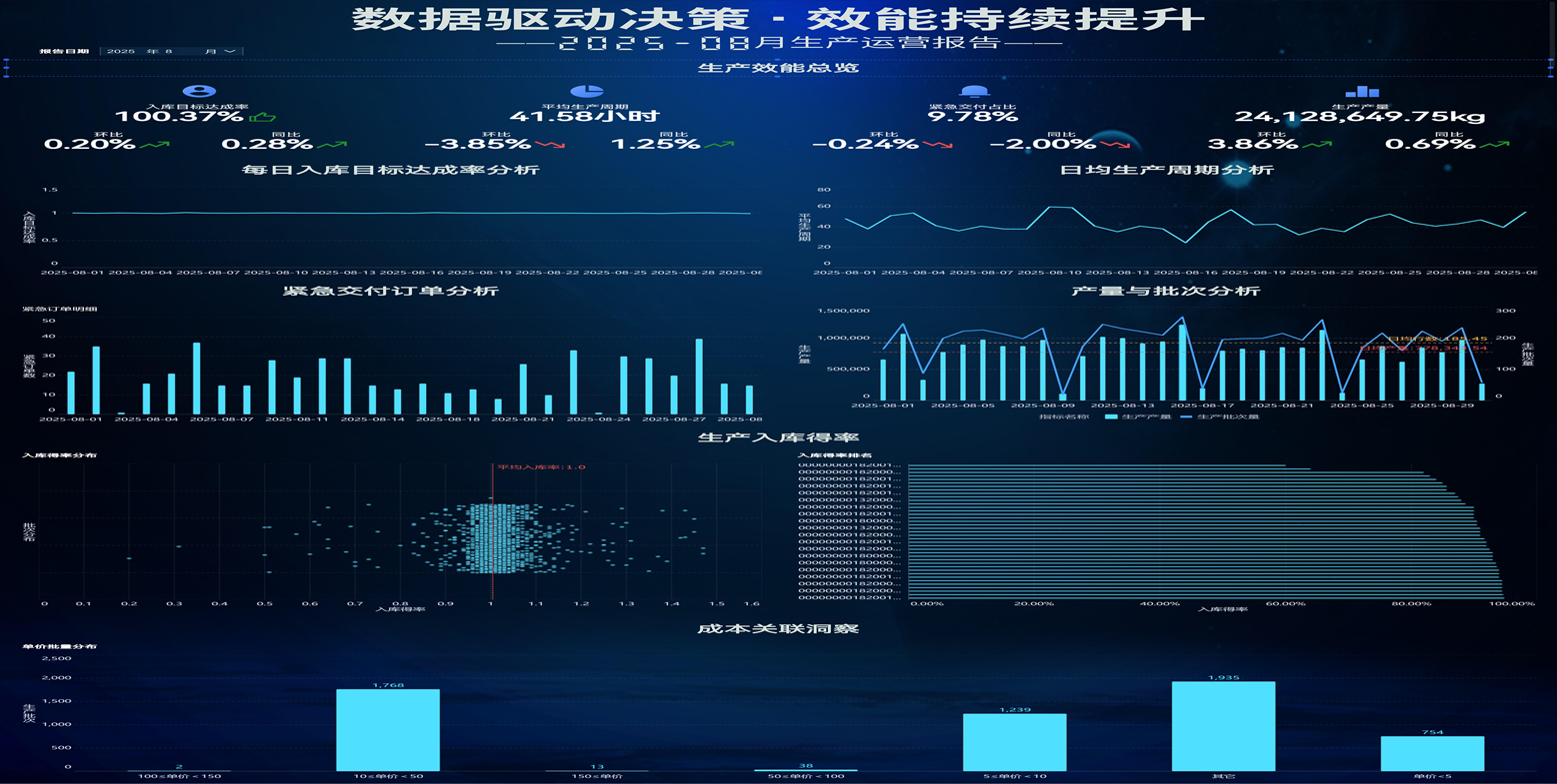 (1) 分析目标 围绕制造企业“保障交付、提升效率、稳定质量”三大核心诉求,设定4个可落地的分析目标: 监控交付表现:掌握每日入库目标达成率的波动情况,识别达成率异常日期(如8月5日、14日、24日等未完全达标),追溯其与生产周期、紧急订单的关联性。 评估生产效率:分析平均生产周期的日度波动与同环比变化,定位效率瓶颈日期(如8月4日周期达53.65小时),探究其原因(如设备故障、订单复杂度高等)。 优化订单结构:监控紧急订单的分布与占比,分析其与生产周期、达成率的相互影响,为生产排程优化提供依据,减少插单对整体计划的冲击。 保障产品质量:通过入库得率分布分析,监控各订单批次的质量稳定性,识别得率异常订单(如得率低于0.97或高于1.05),推动品控前移与工艺改进。