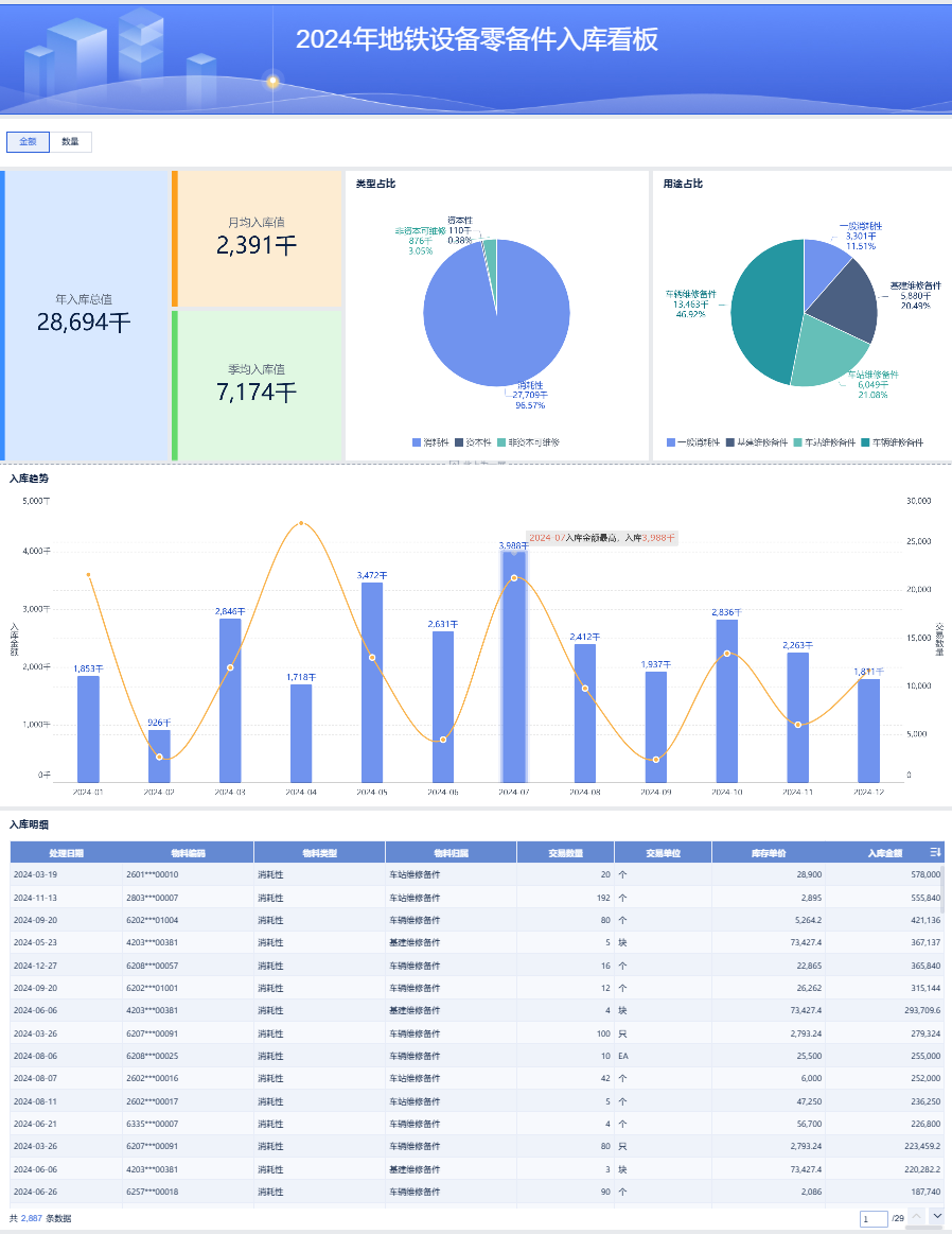 2、饼图-类型占比,饼图-用途占比,组合图-入库趋势,明细表-入库明细