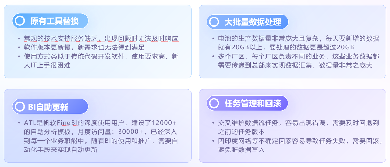 基于这些痛点,ATL开始寻求更优解决方案,并于2020年与帆软结缘。在初步试用后,ATL发现帆软提供从数据抽取到前端展示的完整解决方案,能够有效应对现有挑战。