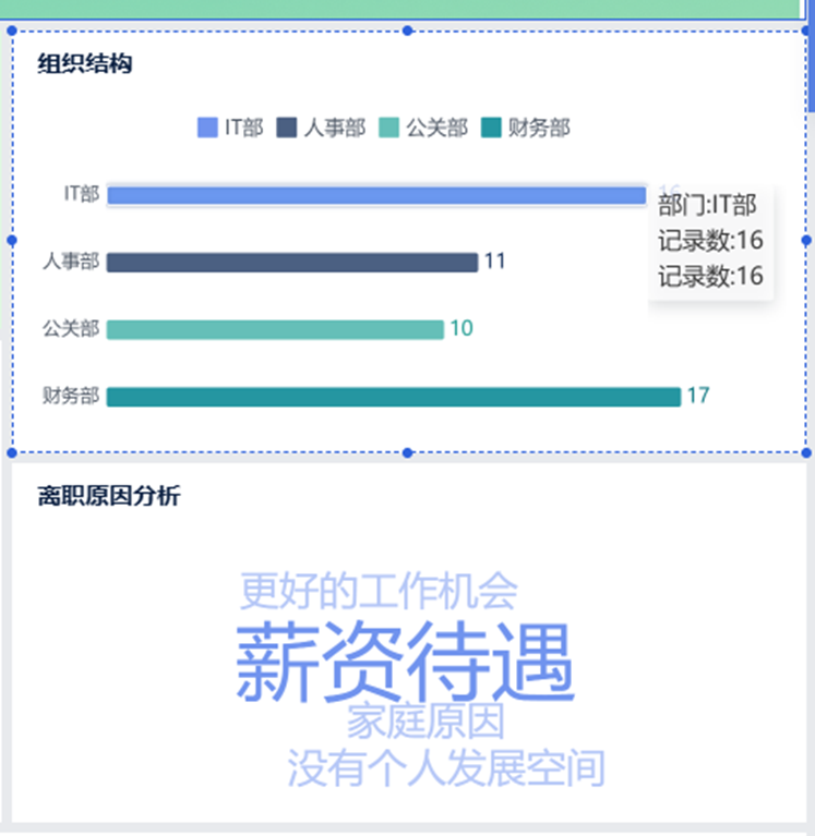 1、指标卡: 在职总人数、新入职员工总数、离职人员总数。