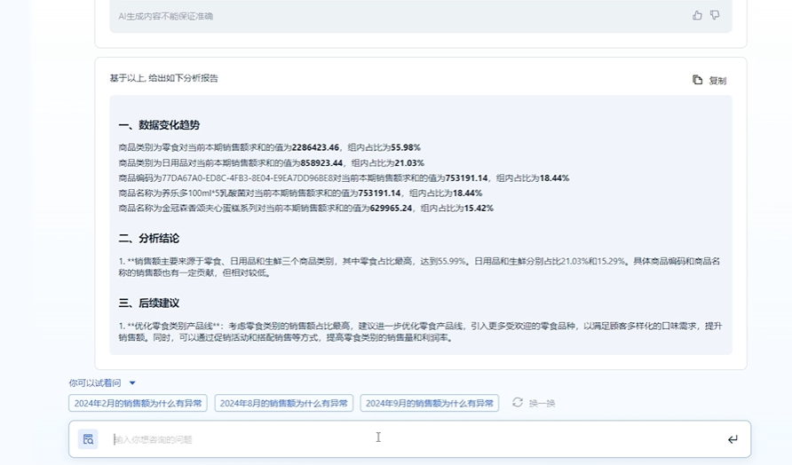 - 还有实时响应这一点,也很关键。现在做生意节奏多快啊,有时候就差那几分钟的决策时间。ChatBI能马上处理你的问题,很快就给出分析结果,不用等半天。比如说管理层开着会呢,突然想知道某个产品现在卖得怎么样,直接问ChatBI,马上就能拿到数据和分析,不耽误开会做决定,这效率确实比以前高多了。