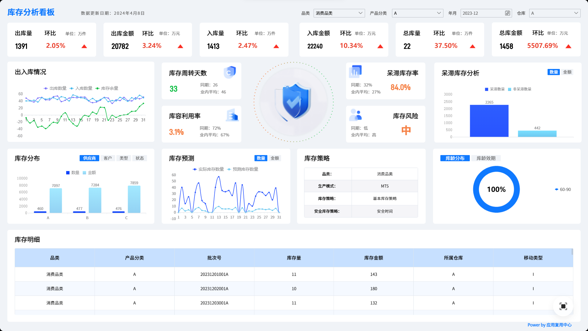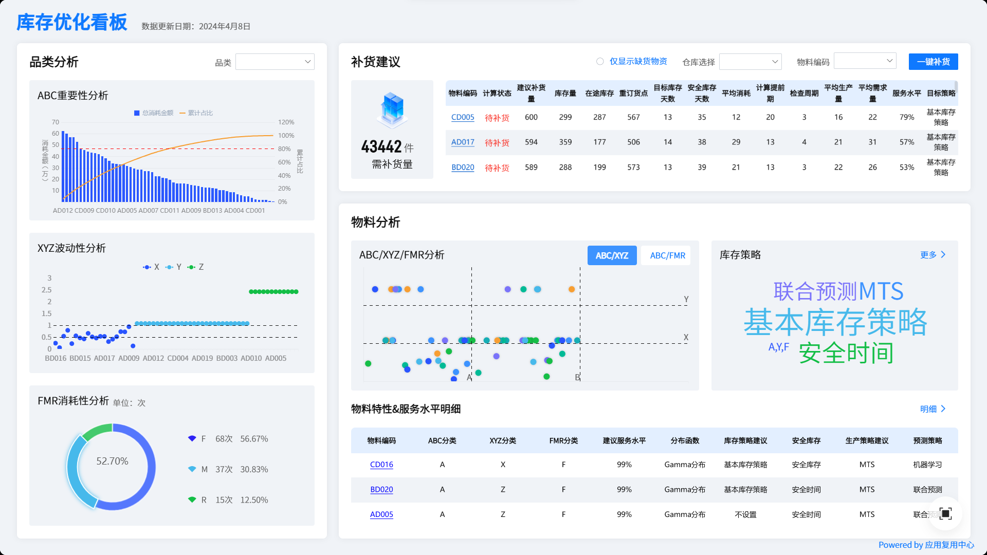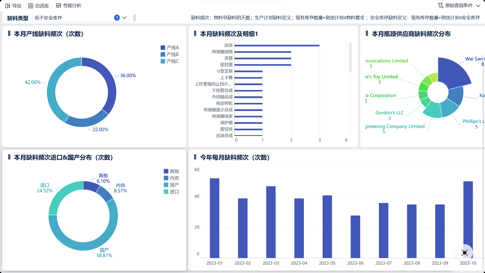 ● 库存优化看板:库存有多少、啥时候该补货、有没有积压风险、物料特性咋适配,全给你监控分析得明明白白。既少花库存冤枉钱,又能让客户不抱怨,市场变了也能跟上, 再也不用对着库存表挠头!