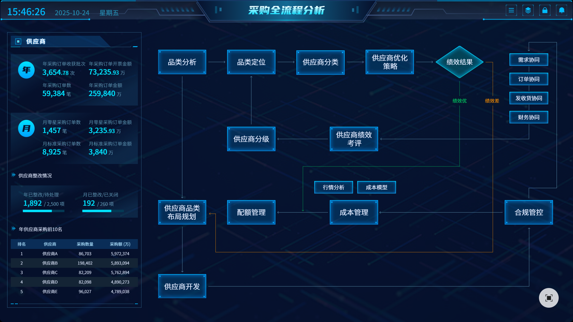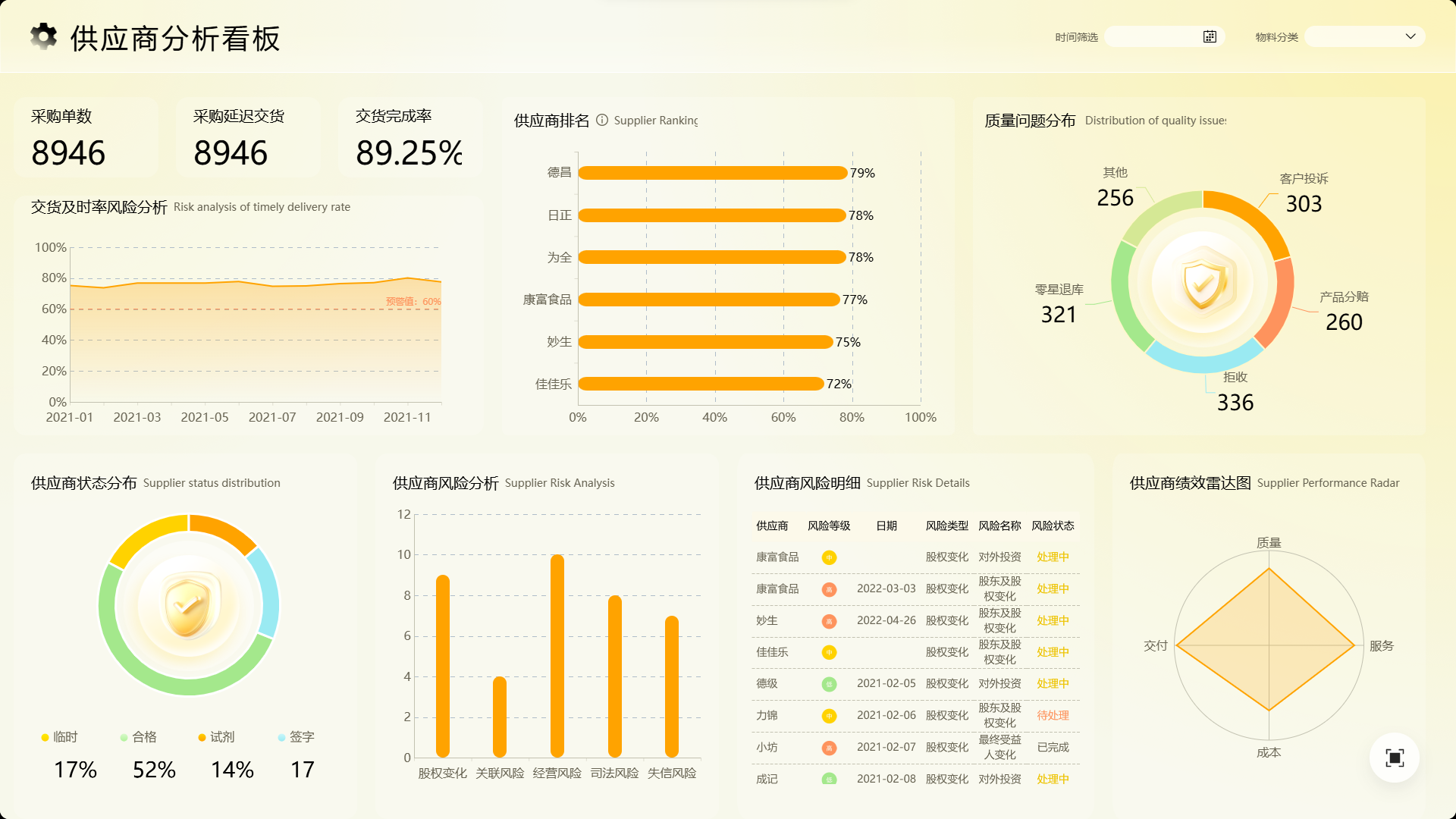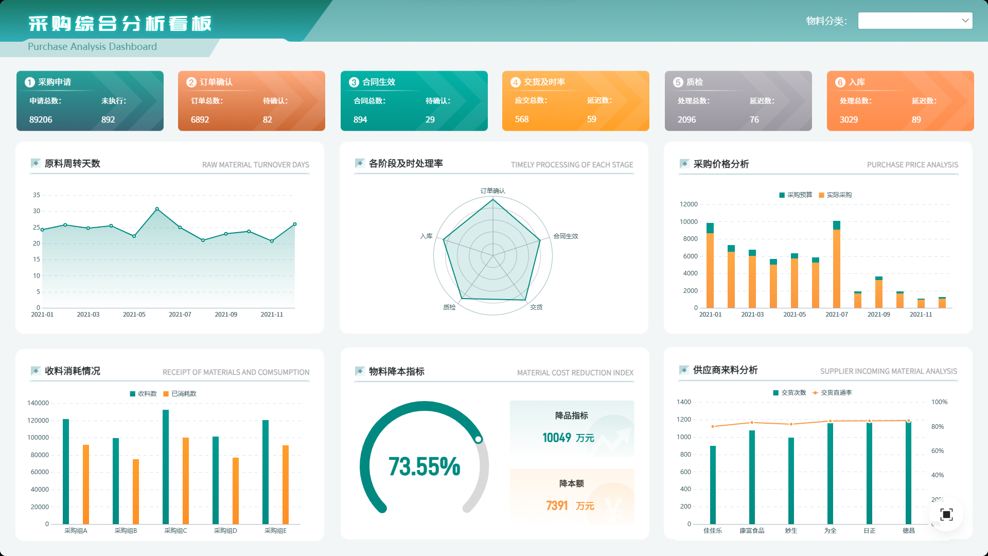 ● 采购全流程分析看板:供应商、品类、行情全局分析,轻松把采购节奏调顺。