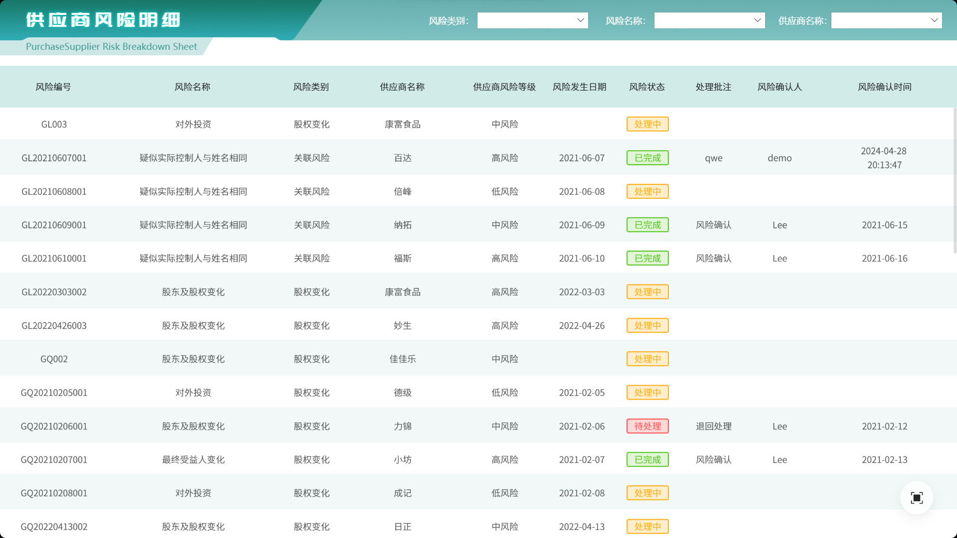 ● 供应商风险明细表:怕供应商搞 “暗操作”?股权变动没察觉、关联风险藏着掖着?明细表来兜底:全记录、细分析,风险等级标得明,处理状态盯得紧,供应链不 “掉链”,合规不踩坑,是你的 “供应商风险管家”,绝对靠谱!