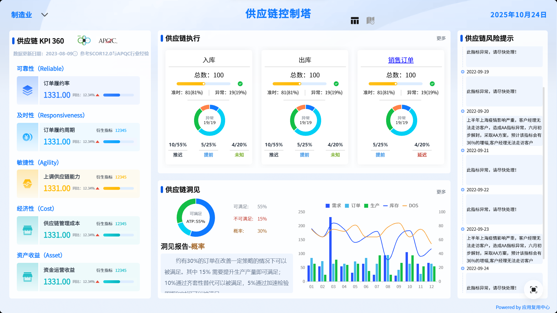 基础供应链专盯单个供应链环节进行监测。通过数据仓库整合数据,制作精准化、专业化看板,从营销、计划、采购到生产、物流,供应链全环节覆盖,操作简单、部署快,能立马提升业务实时决策能力,真正做到 “单点突破,全局受益”。