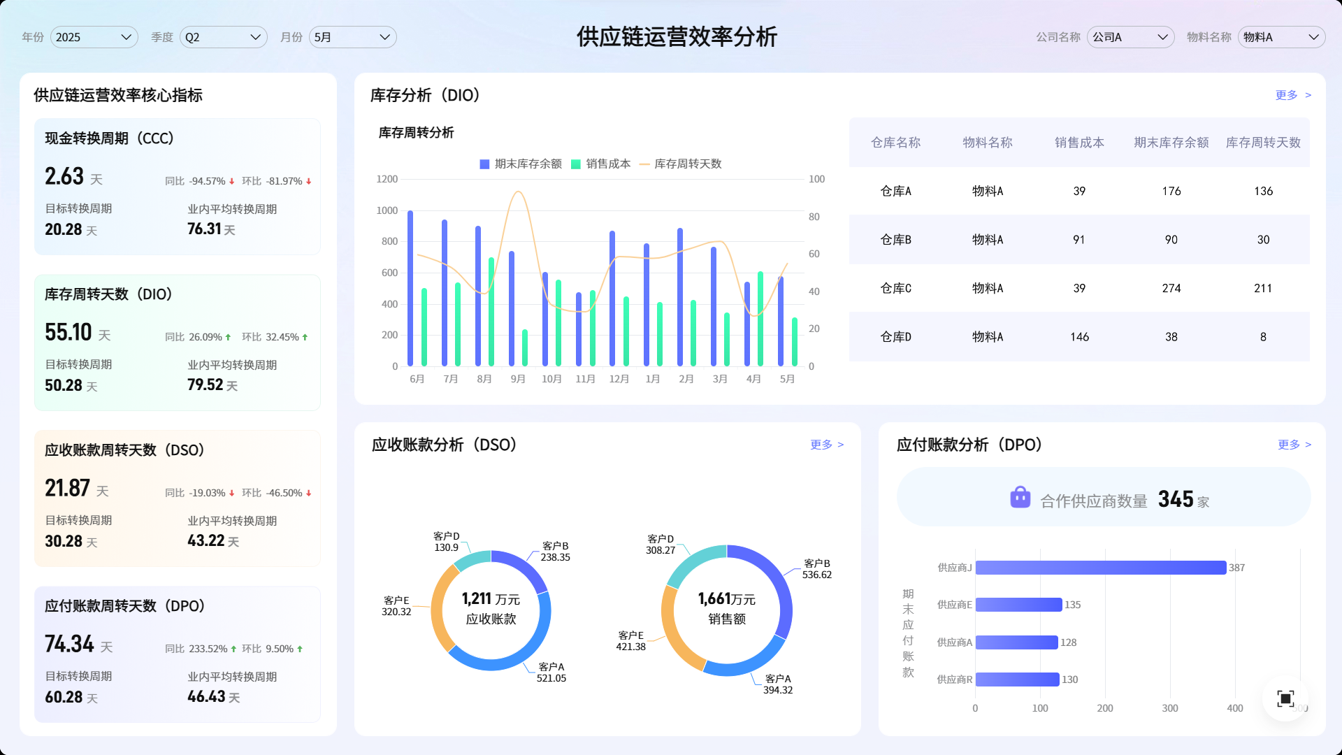 ● 供应链运营效率分析看板:供应链运营效率看板直接联动财务和业务,现金流周转健康度一眼瞅见,帮你精准把控资金效率 —— 钱袋子的事儿,有它就不慌!