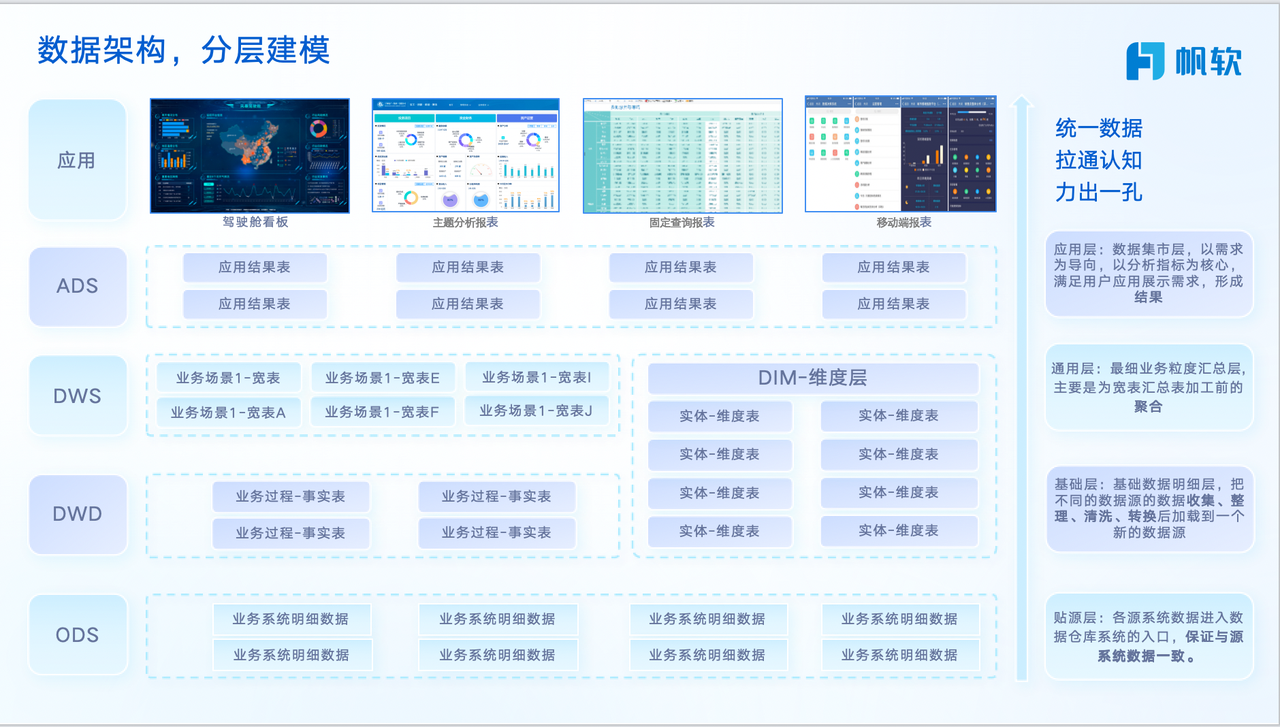 帆软的数字化转型始于对数据体系的系统性重构。帆软以高可用数据底座为核心,打通了从数据采集、清洗、存储到分析应用的全链路,建立起覆盖ODS、DWD、DWS、ADS的四层数据架构。