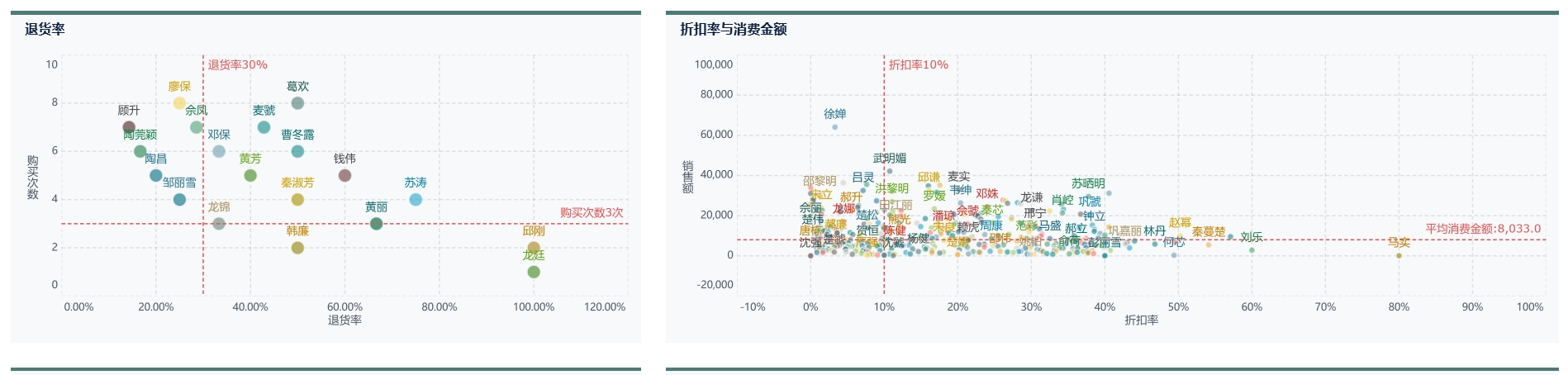 另一方面,针对喜欢购买折扣商品的客户(折扣率>10%,消费金额>平均值),可以考虑通过短信等途径精准投送商品促销信息,进一步提高该部分客户的消费金额。
