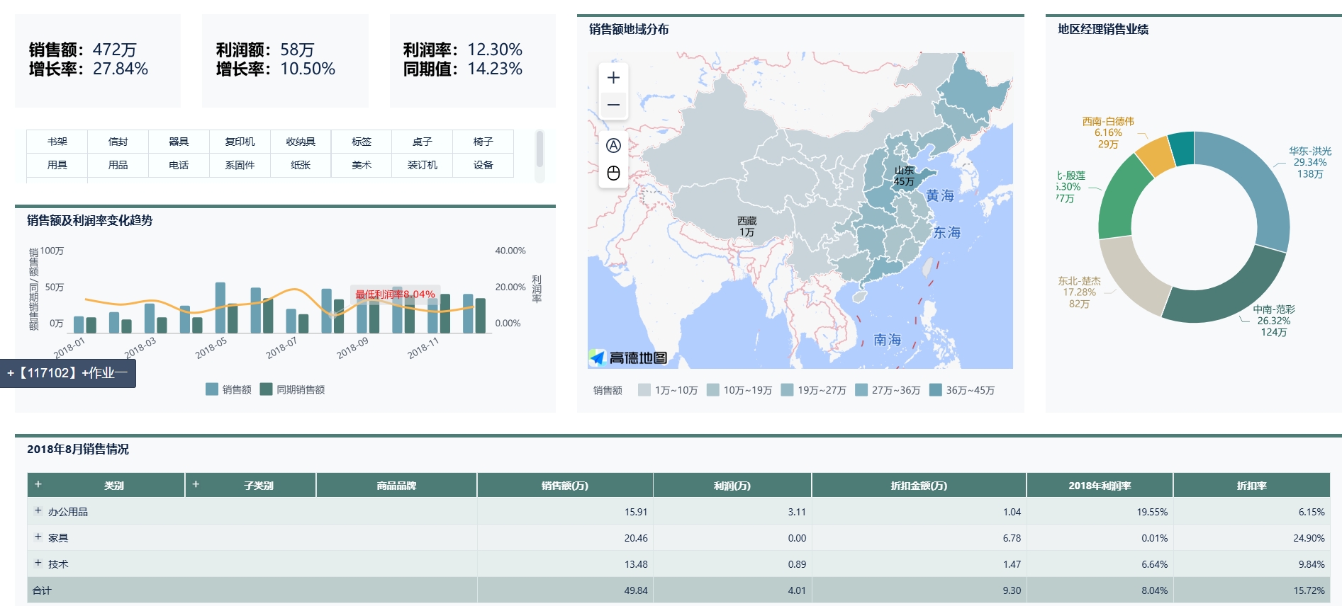 首先通过指标卡发现2018年虽然收入和利润都较上一年度有所增长,但利润率较同期有所下滑,通过销售额及利润率变化趋势图可以看出8月利润率最低达8.04%,8月按类别展开后发现家具类产品拉低了当月的利润率,进一步展开家具类下的子类别发现桌子类产品8月毛利率为负达-37.46%,桌子类产品在8月大力度打折出售影响了当月毛利率表现。